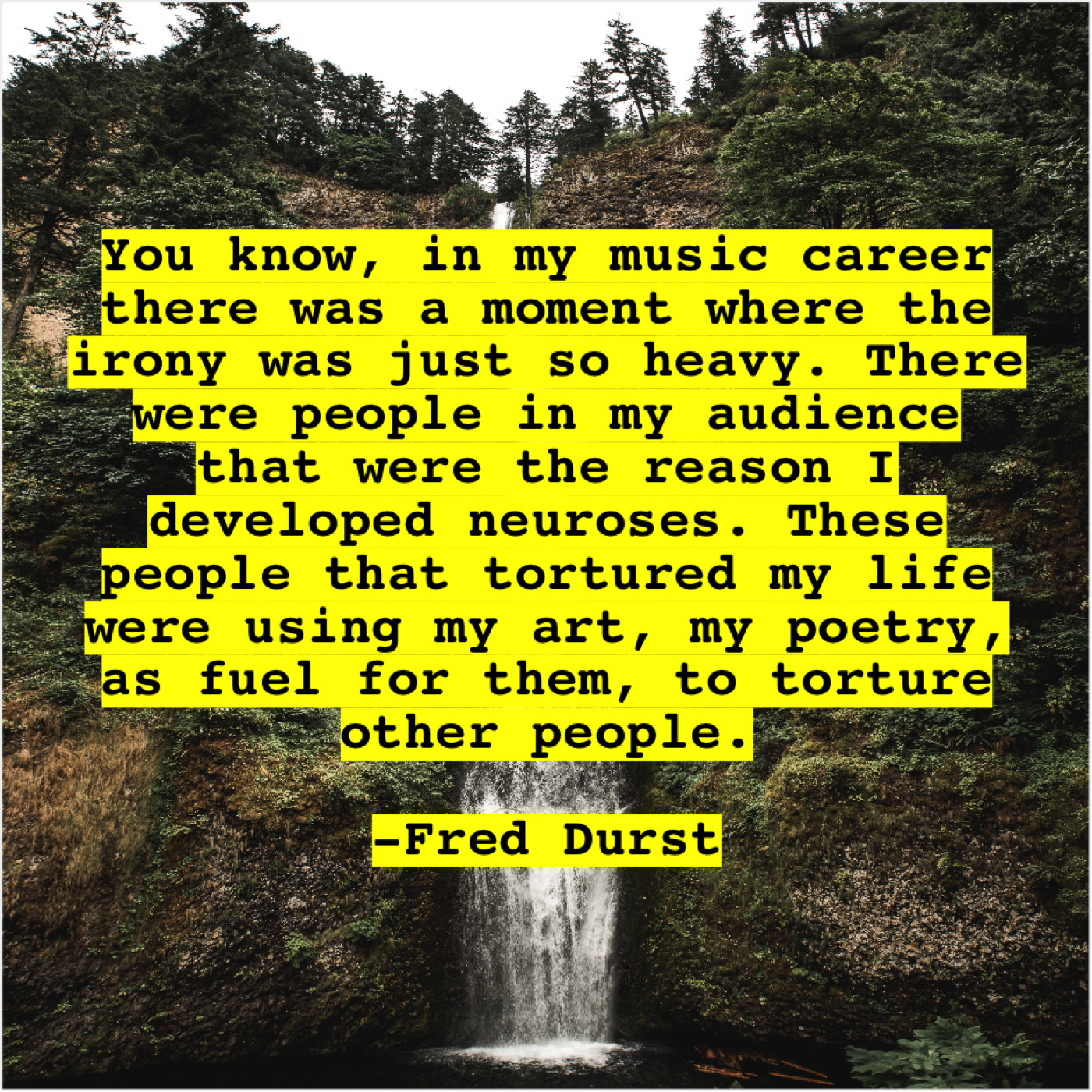 “You know, in my music career there was a moment where the irony was just so heavy. There were people in my audience that were the reason I developed neuroses. These people that tortured my life were using my art, my poetry, as fuel for them, to torture other people.”
