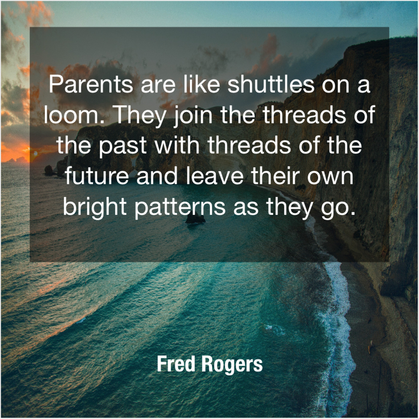 Fred Rogers Fred Rogers – Parents are like shuttles on… January 13, 2019 admin “Parents are like shuttles on a loom. They join the threads of the past with threads of the future and leave their own bright patterns as they go.”-Fred Rogers