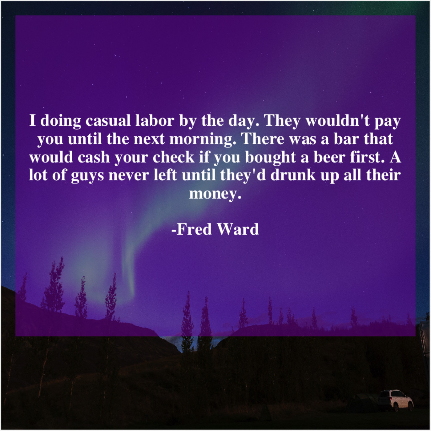 Fred Ward Fred Ward – I doing casual labor by… March 19, 2019 admin “I doing casual labor by the day. They wouldn’t pay you until the next morning. There was a bar that would cash your check if you bought a beer first. A lot of guys never left until they’d drunk up all their money.”-Fred Ward