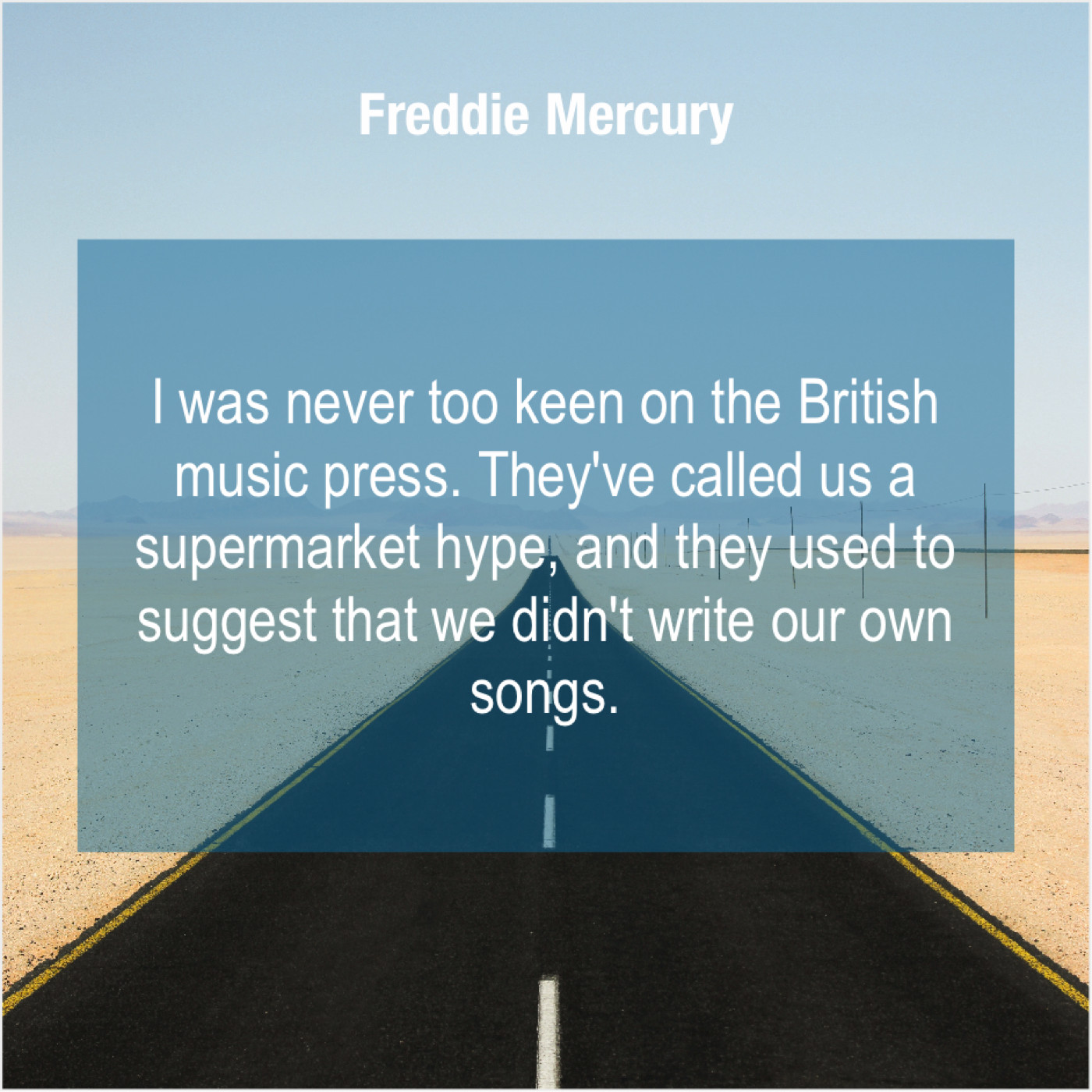 Freddie Mercury Freddie Mercury – I was never too keen… March 3, 2019 admin “I was never too keen on the British music press. They’ve called us a supermarket hype, and they used to suggest that we didn’t write our own songs.”-Freddie Mercury