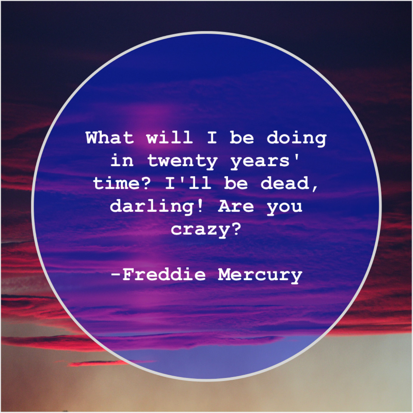 Freddie Mercury Freddie Mercury – What will I be doing… January 10, 2019 admin “What will I be doing in twenty years’ time? I’ll be dead, darling! Are you crazy?”-Freddie Mercury