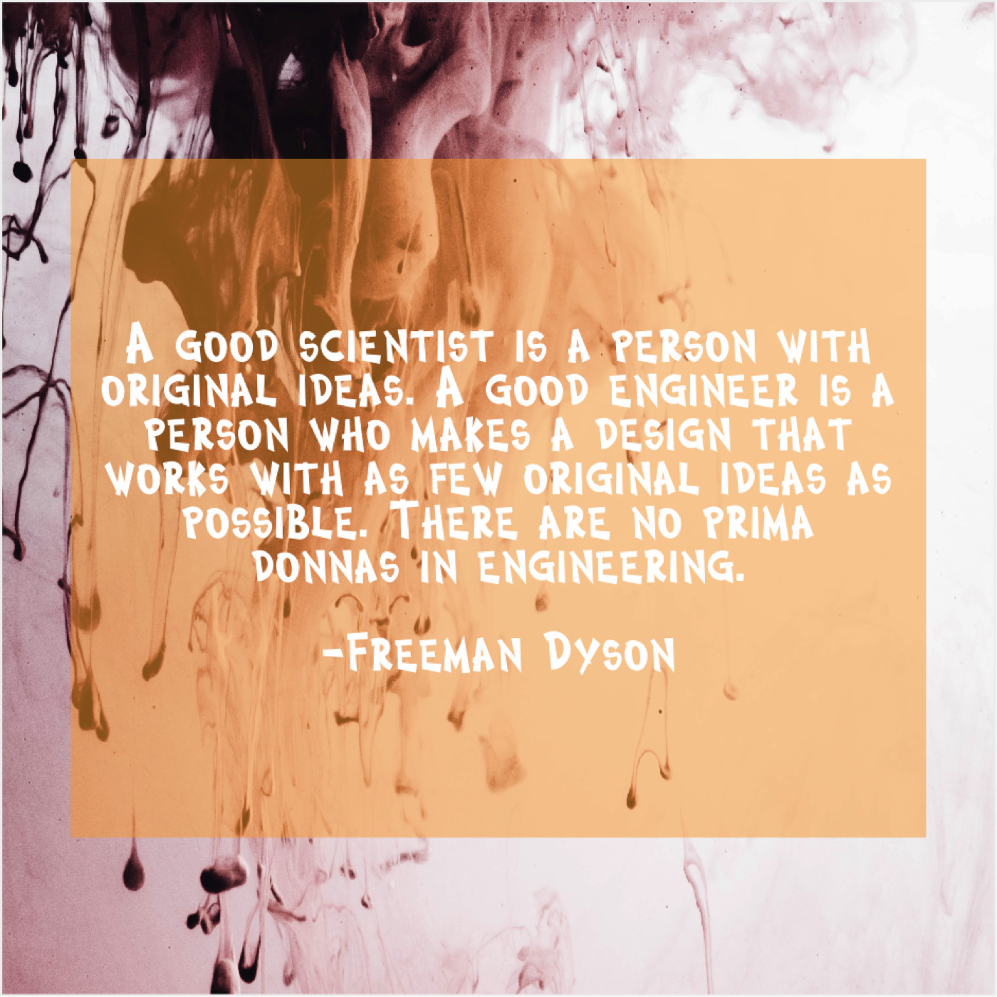 Freeman Dyson Freeman Dyson – A good scientist is a… November 22, 2018 admin “A good scientist is a person with original ideas. A good engineer is a person who makes a design that works with as few original ideas as possible. There are no prima donnas in engineering.”-Freeman Dyson