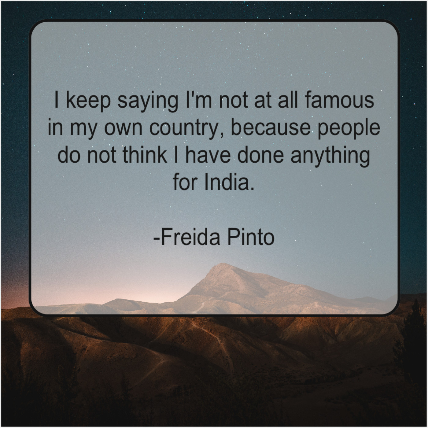 Freida Pinto Freida Pinto – I keep saying I’m not… November 24, 2018 admin “I keep saying I’m not at all famous in my own country, because people do not think I have done anything for India.”-Freida Pinto