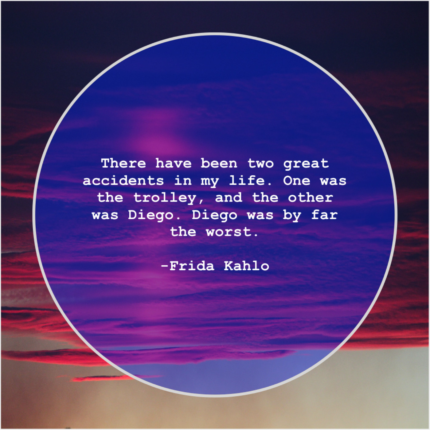 Frida Kahlo Frida Kahlo – There have been two great… September 14, 2019 admin “There have been two great accidents in my life. One was the trolley, and the other was Diego. Diego was by far the worst.”-Frida Kahlo