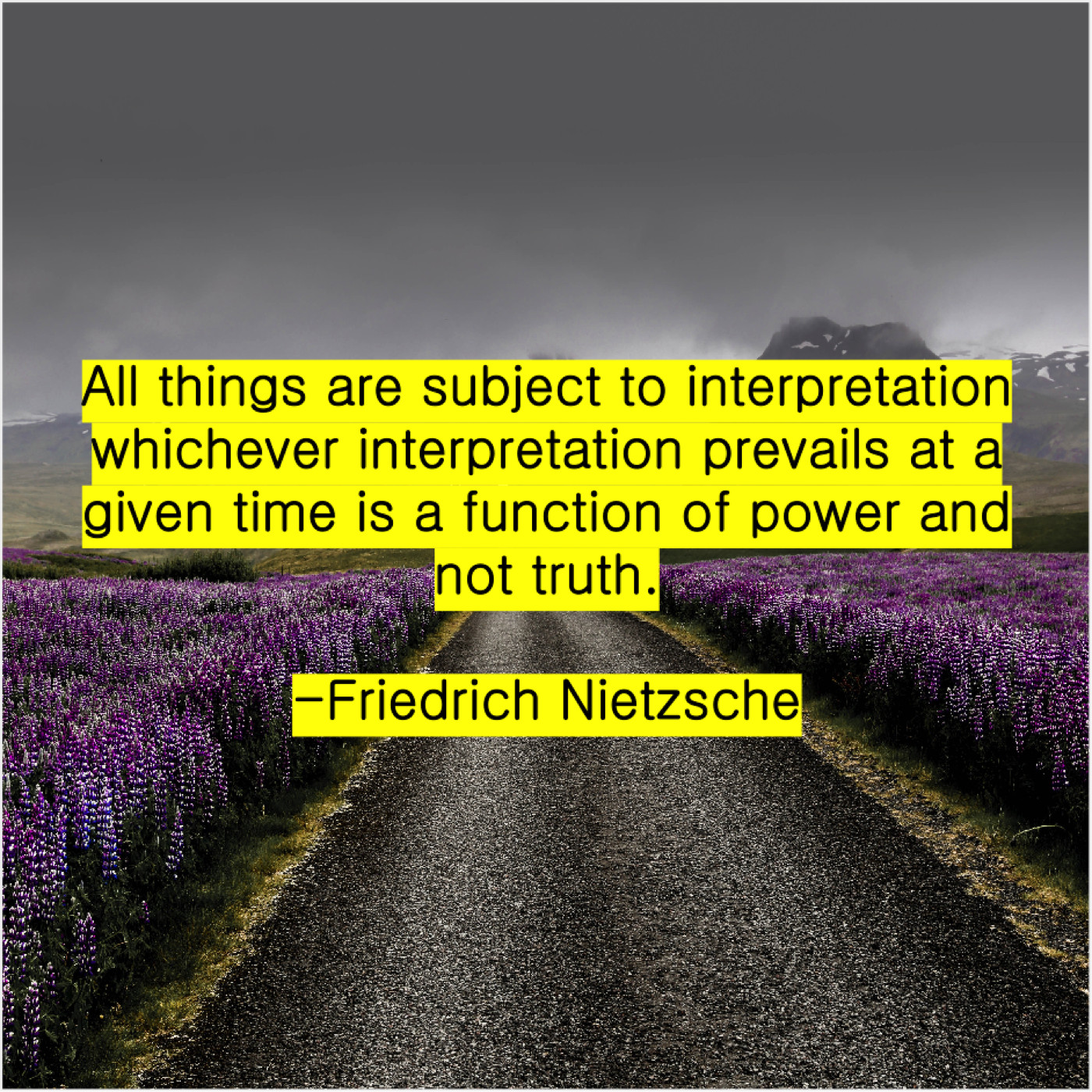 Friedrich Nietzsche Friedrich Nietzsche – All things are subject to… May 2, 2019 admin “All things are subject to interpretation whichever interpretation prevails at a given time is a function of power and not truth.”-Friedrich Nietzsche