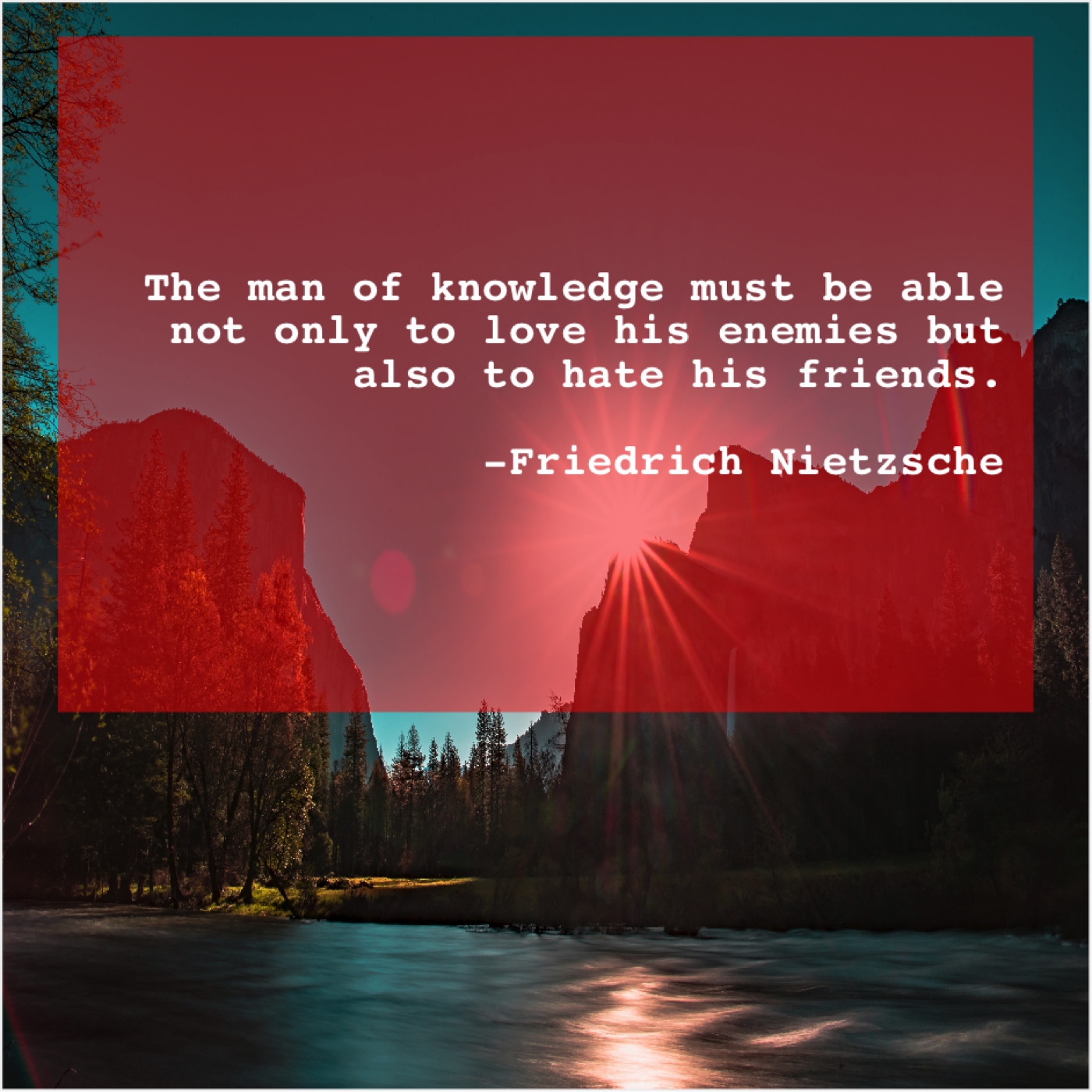 Friedrich Nietzsche Friedrich Nietzsche – The man of knowledge must… December 14, 2018 admin “The man of knowledge must be able not only to love his enemies but also to hate his friends.”-Friedrich Nietzsche