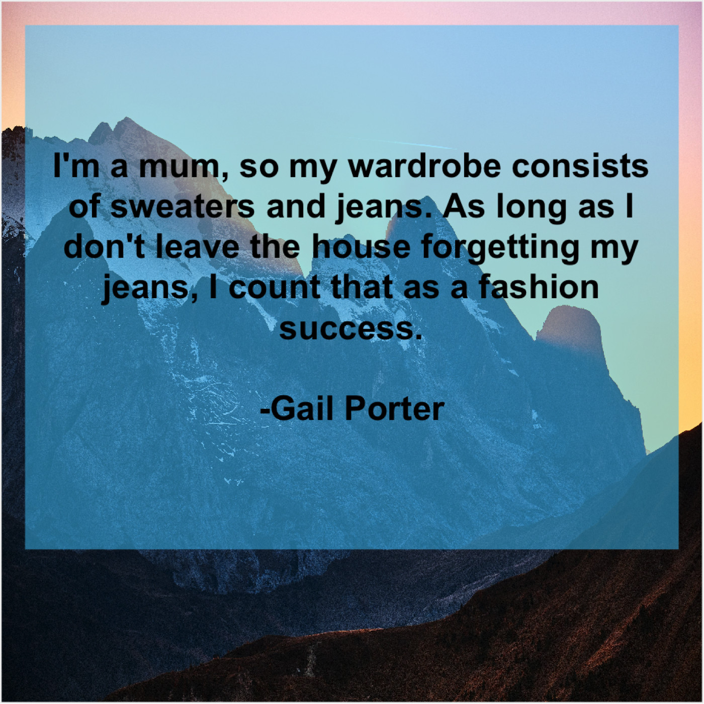 Gail Porter Gail Porter – I’m a mum, so my… August 18, 2019 admin “I’m a mum, so my wardrobe consists of sweaters and jeans. As long as I don’t leave the house forgetting my jeans, I count that as a fashion success.”-Gail Porter