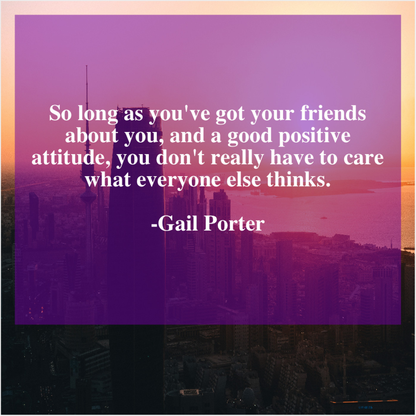 Gail Porter Gail Porter – So long as you’ve got… July 28, 2019 admin “So long as you’ve got your friends about you, and a good positive attitude, you don’t really have to care what everyone else thinks.”-Gail Porter