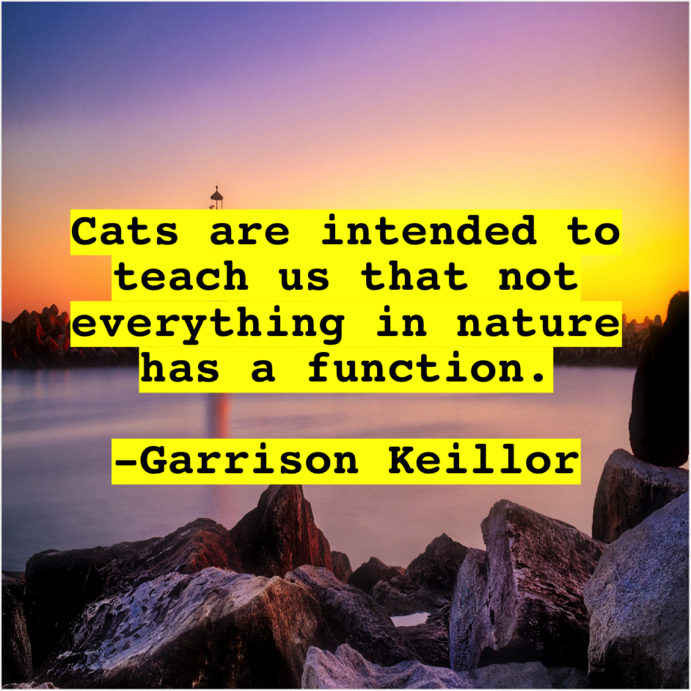 Garrison Keillor Garrison Keillor – Cats are intended to teach… August 20, 2019 admin “Cats are intended to teach us that not everything in nature has a function.”-Garrison Keillor
