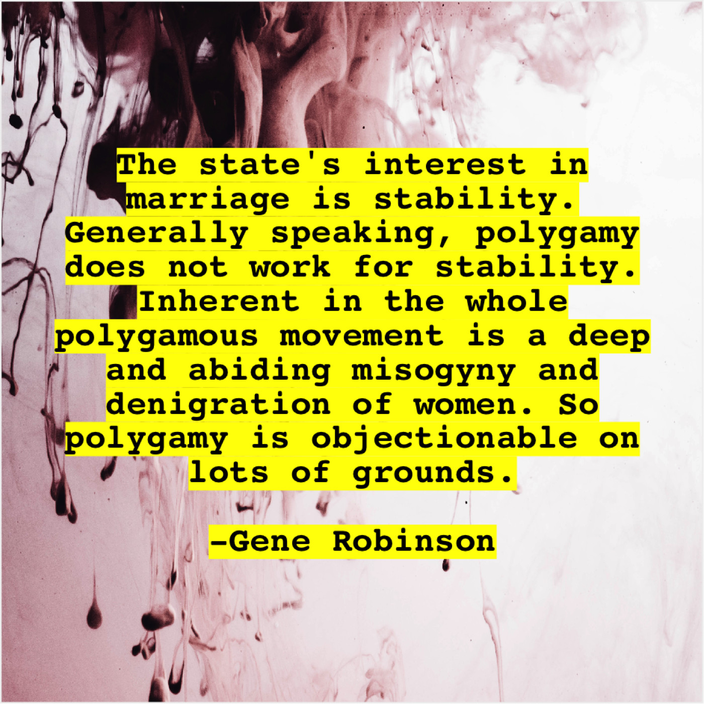 “The state’s interest in marriage is stability. Generally speaking, polygamy does not work for stability. Inherent in the whole polygamous movement is a deep and abiding misogyny and denigration of women. So polygamy is objectionable on lots of grounds.”