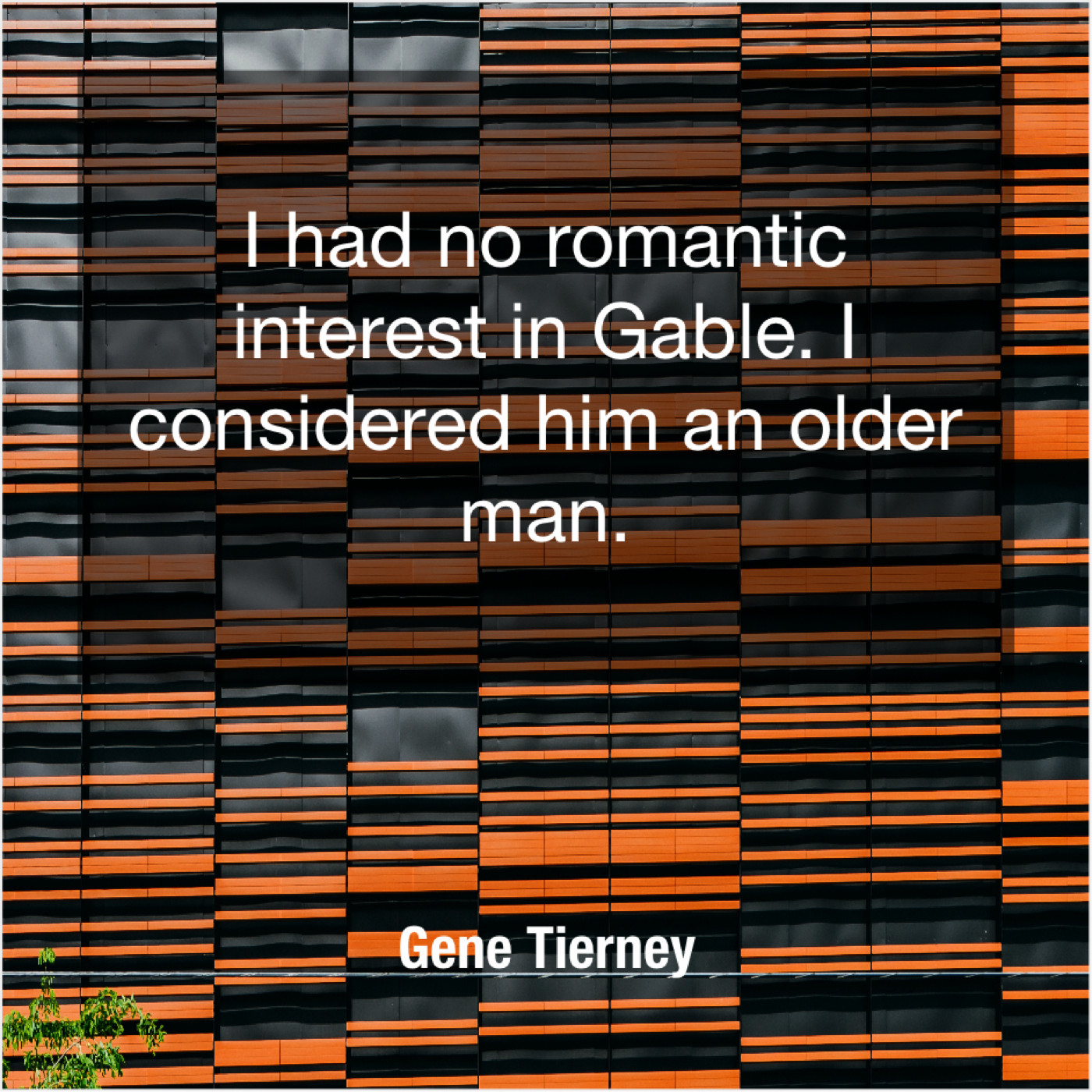 Gene Tierney Gene Tierney – I had no romantic interest… October 31, 2018 admin “I had no romantic interest in Gable. I considered him an older man.”-Gene Tierney