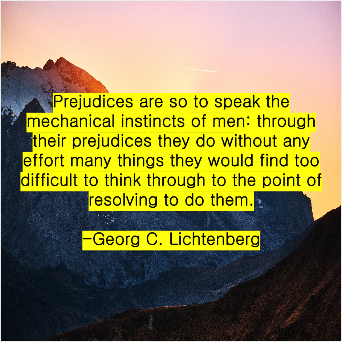 Georg C. Lichtenberg Georg C. Lichtenberg – Prejudices are so to speak… April 7, 2019 admin “Prejudices are so to speak the mechanical instincts of men: through their prejudices they do without any effort many things they would find too difficult to think through to the point of resolving to do them.”-Georg C. Lichtenberg