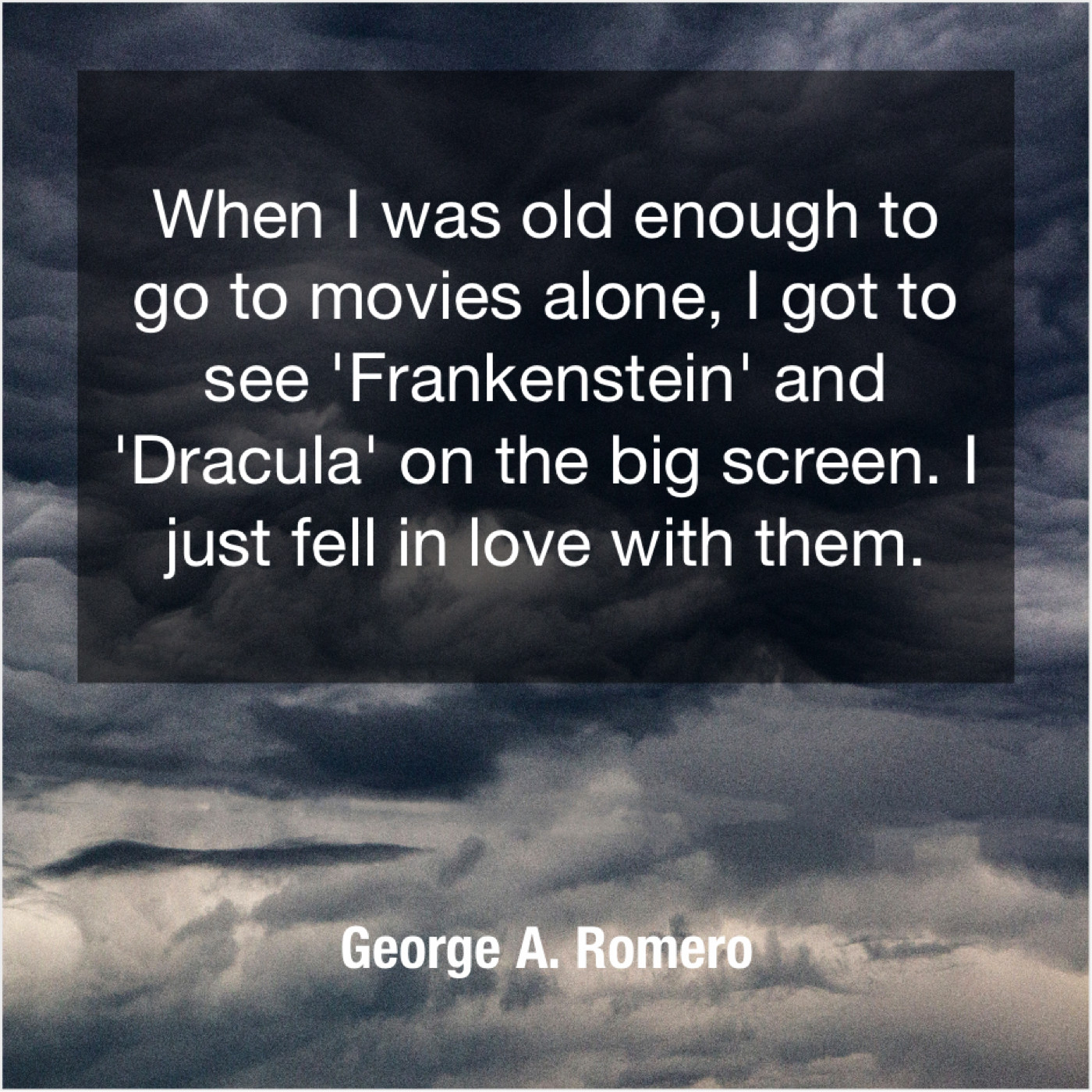 George A. Romero George A. Romero – When I was old enough… February 28, 2019 admin “When I was old enough to go to movies alone, I got to see ‘Frankenstein’ and ‘Dracula’ on the big screen. I just fell in love with them.”-George A. Romero