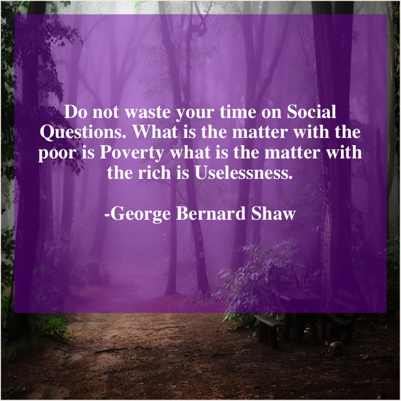 George Bernard Shaw George Bernard Shaw – Do not waste your time… July 17, 2019 admin “Do not waste your time on Social Questions. What is the matter with the poor is Poverty what is the matter with the rich is Uselessness.”-George Bernard Shaw
