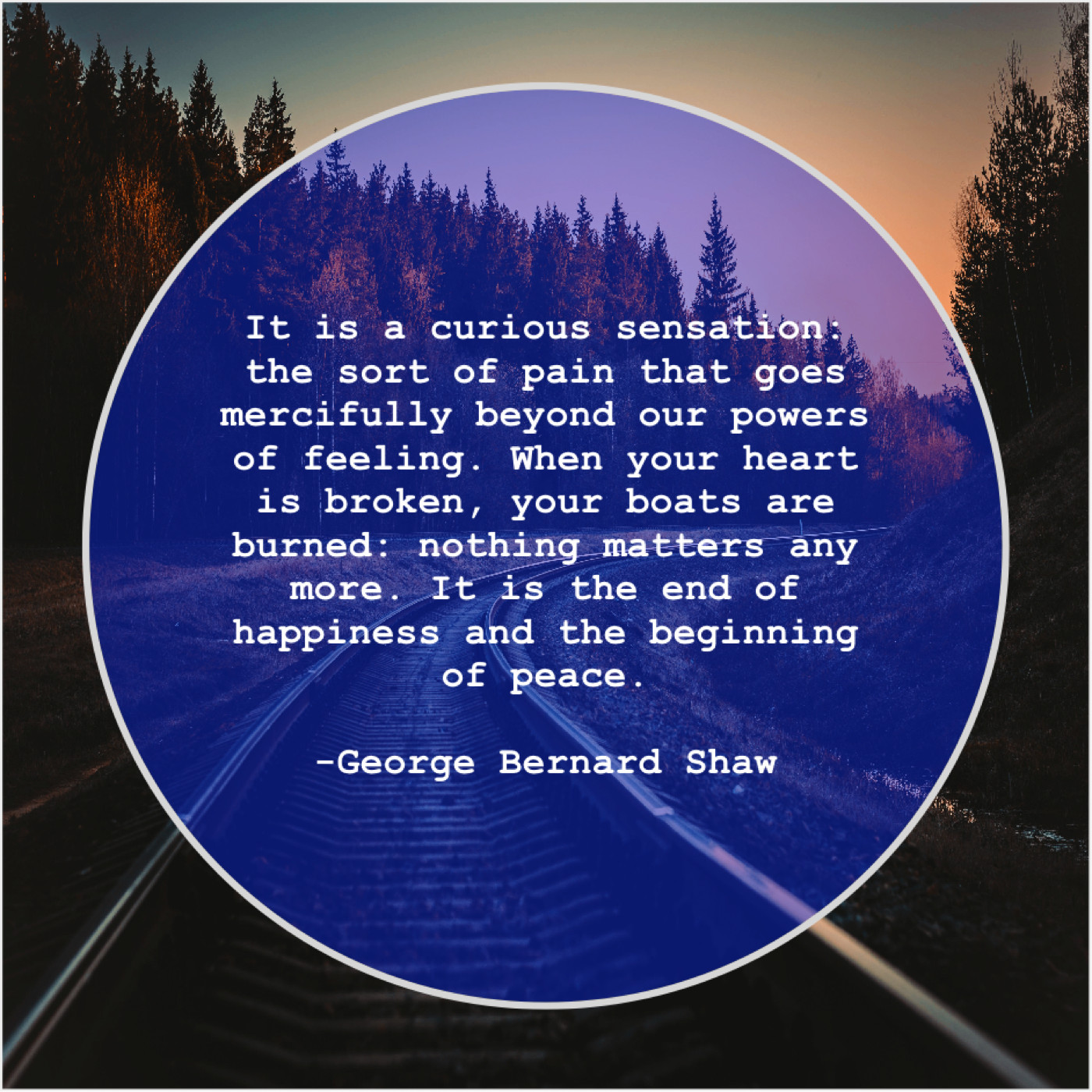 George Bernard Shaw George Bernard Shaw – It is a curious sensation… April 26, 2019 admin “It is a curious sensation: the sort of pain that goes mercifully beyond our powers of feeling. When your heart is broken, your boats are burned: nothing matters any more. It is the end of happiness and the beginning of peace.”-George Bernard Shaw
