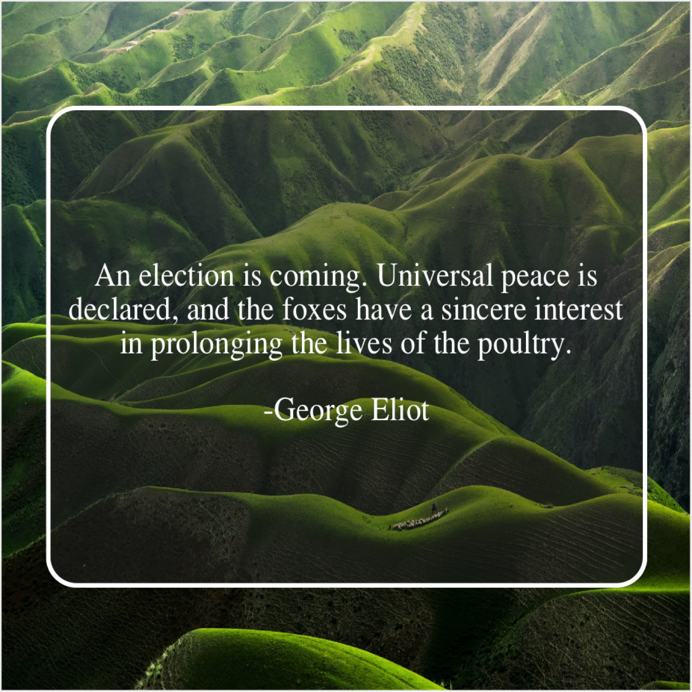 George Eliot George Eliot – An election is coming. Universal… April 8, 2019 admin “An election is coming. Universal peace is declared, and the foxes have a sincere interest in prolonging the lives of the poultry.”-George Eliot