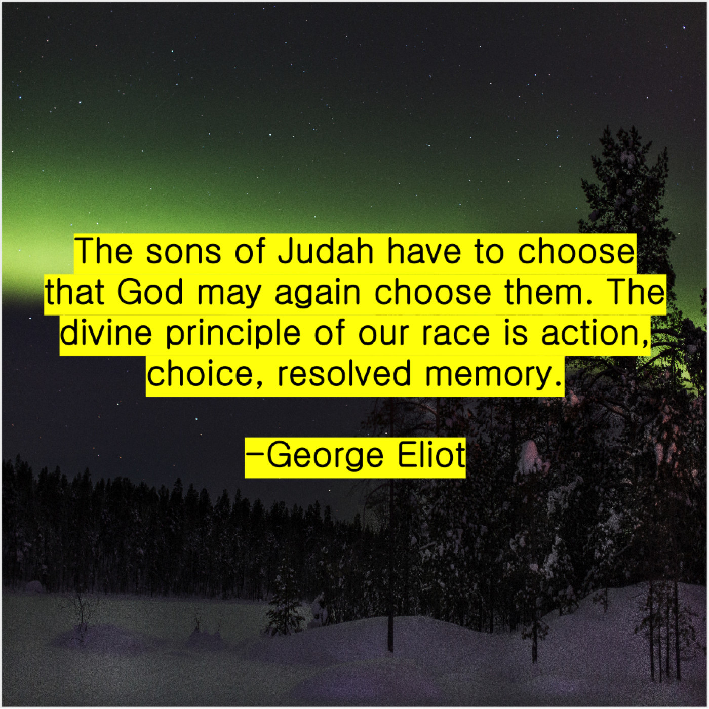 George Eliot George Eliot – The sons of Judah have… February 5, 2019 admin “The sons of Judah have to choose that God may again choose them. The divine principle of our race is action, choice, resolved memory.”-George Eliot