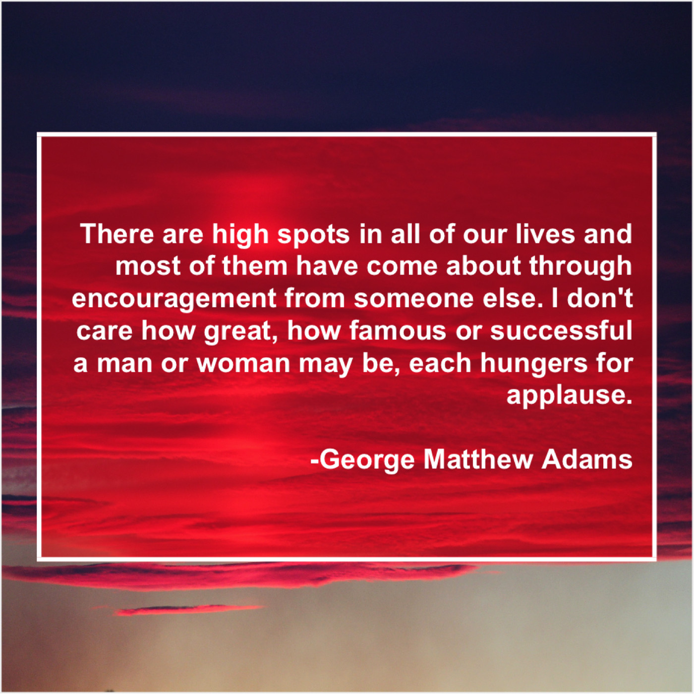 George Matthew Adams George Matthew Adams – There are high spots in… August 3, 2019 admin “There are high spots in all of our lives and most of them have come about through encouragement from someone else. I don’t care how great, how famous or successful a man or woman may be, each hungers for applause.”-George Matthew Adams