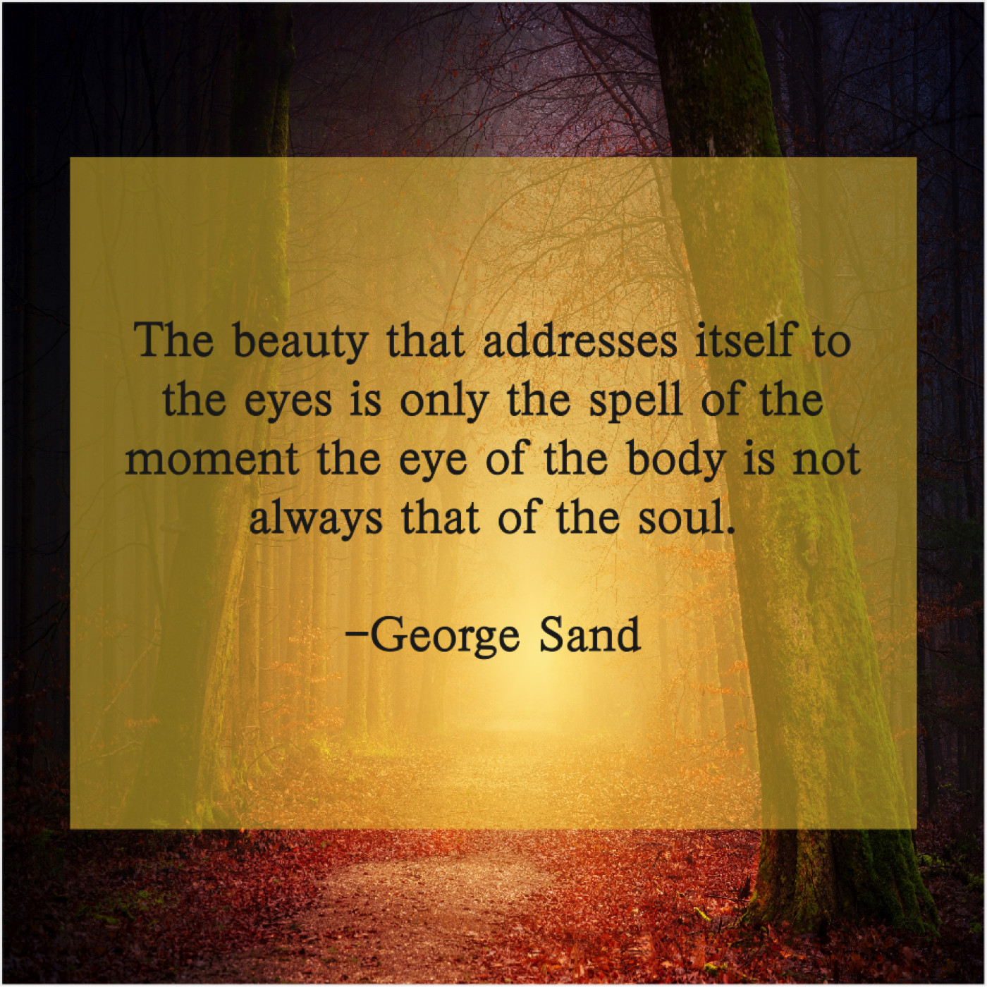 George Sand George Sand – The beauty that addresses itself… March 18, 2019 admin “The beauty that addresses itself to the eyes is only the spell of the moment the eye of the body is not always that of the soul.”-George Sand