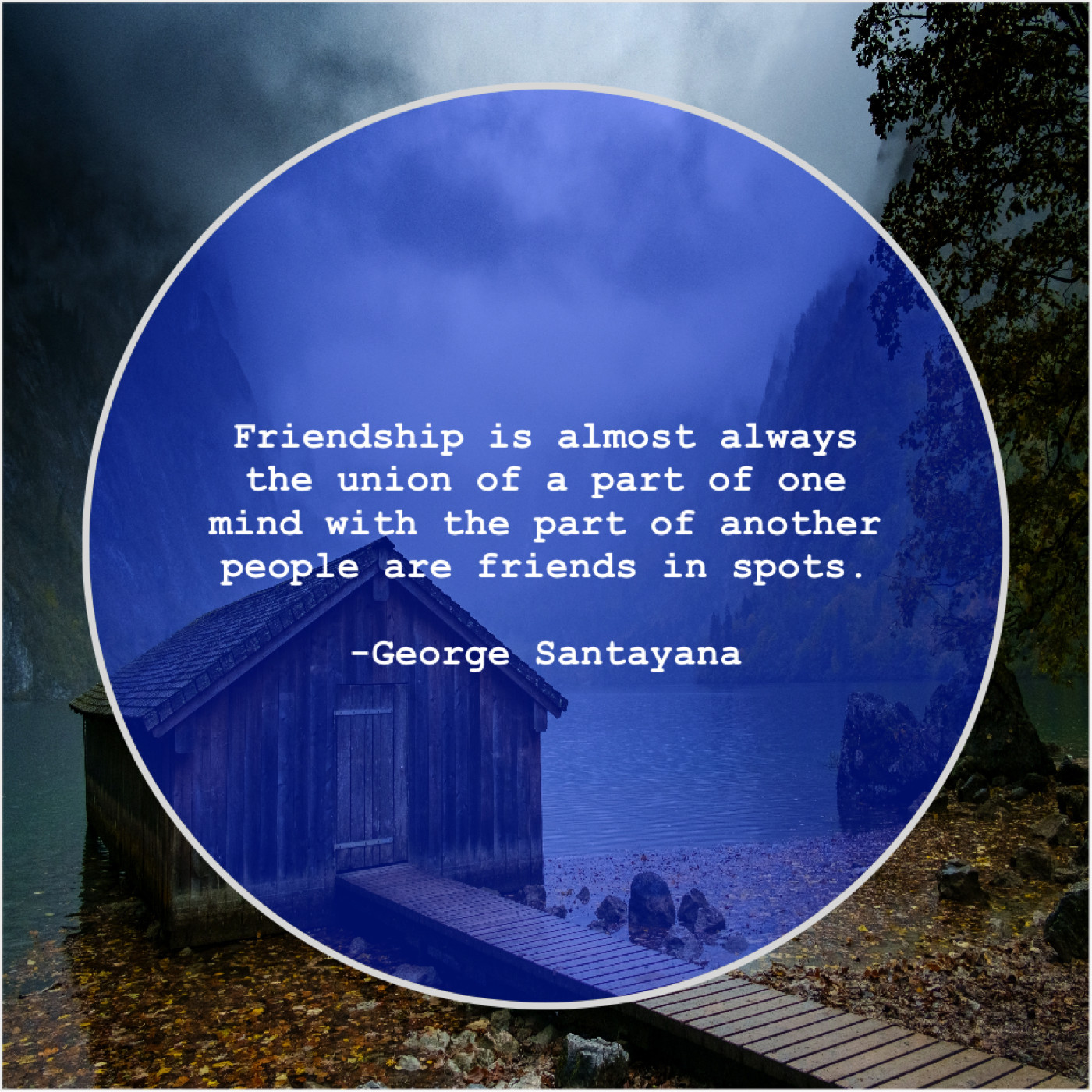 George Santayana George Santayana – Friendship is almost always the… September 21, 2019 admin “Friendship is almost always the union of a part of one mind with the part of another people are friends in spots.”-George Santayana
