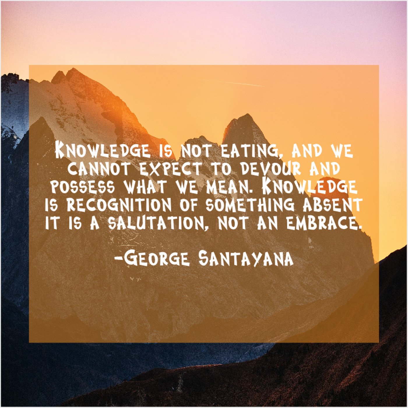 George Santayana George Santayana – Knowledge is not eating, and… June 25, 2019 admin “Knowledge is not eating, and we cannot expect to devour and possess what we mean. Knowledge is recognition of something absent it is a salutation, not an embrace.”-George Santayana