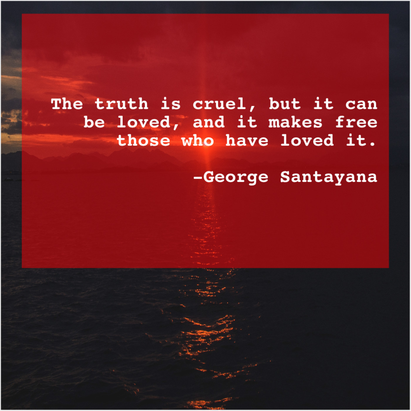 George Santayana George Santayana – The truth is cruel, but… October 13, 2019 admin “The truth is cruel, but it can be loved, and it makes free those who have loved it.”-George Santayana
