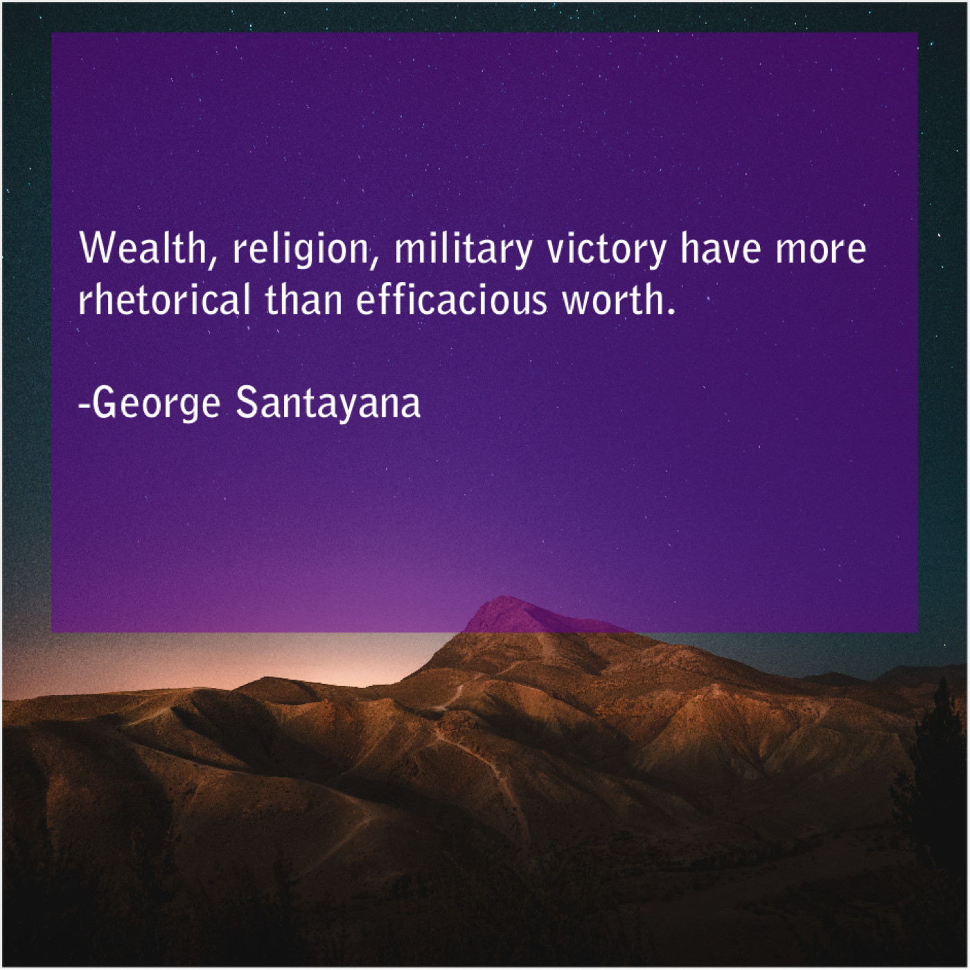 George Santayana George Santayana – Wealth, religion, military victory have… October 14, 2019 admin “Wealth, religion, military victory have more rhetorical than efficacious worth.”-George Santayana