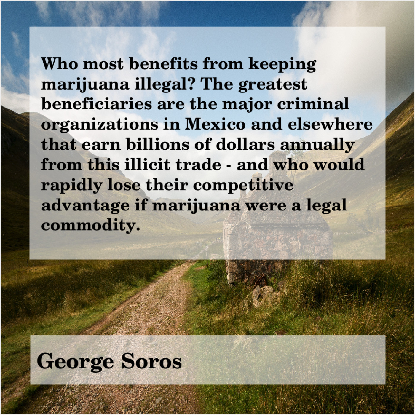 “Who most benefits from keeping marijuana illegal? The greatest beneficiaries are the major criminal organizations in Mexico and elsewhere that earn billions of dollars annually from this illicit trade – and who would rapidly lose their competitive advantage if marijuana were a legal commodity.”