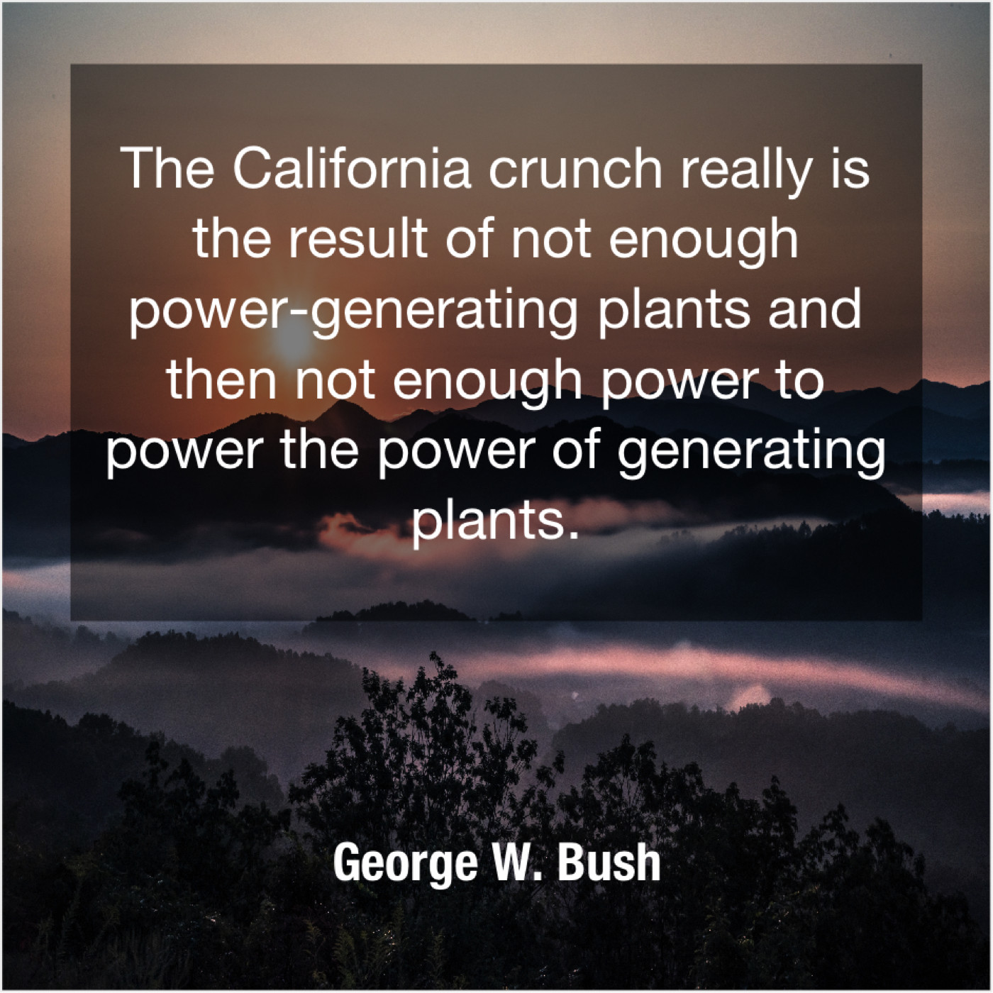 George W. Bush George W. Bush – The California crunch really is… May 18, 2019 admin “The California crunch really is the result of not enough power-generating plants and then not enough power to power the power of generating plants.”-George W. Bush