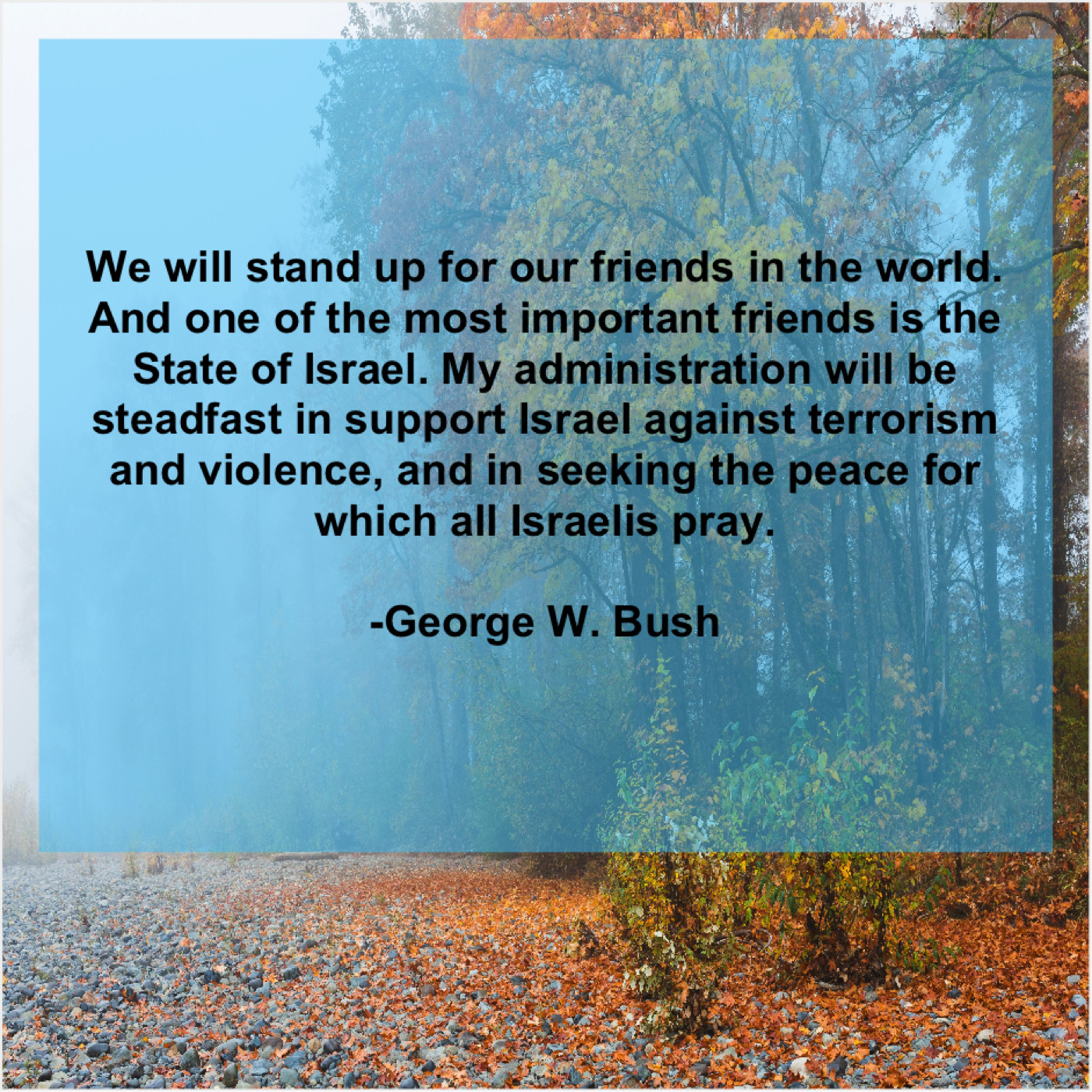 “We will stand up for our friends in the world. And one of the most important friends is the State of Israel. My administration will be steadfast in support Israel against terrorism and violence, and in seeking the peace for which all Israelis pray.”