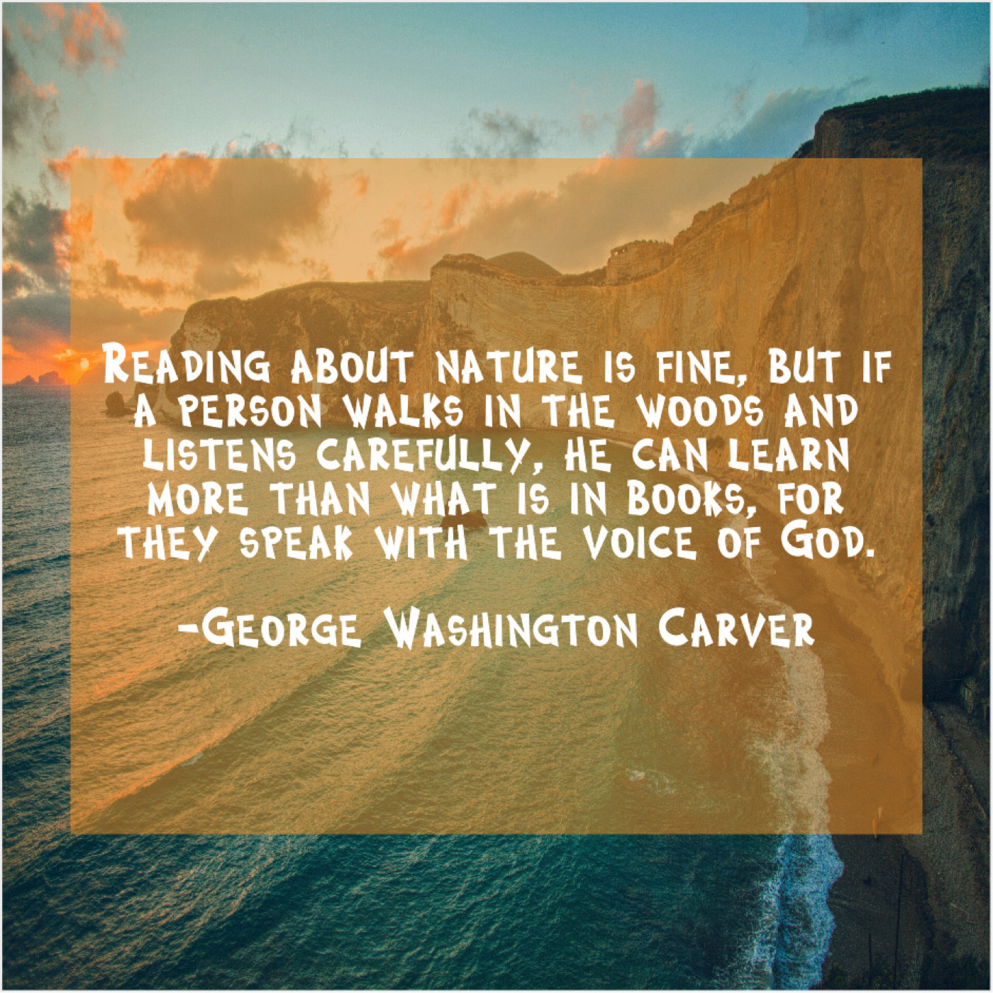 George Washington Carver George Washington Carver – Reading about nature is fine… August 18, 2019 admin “Reading about nature is fine, but if a person walks in the woods and listens carefully, he can learn more than what is in books, for they speak with the voice of God.”-George Washington Carver