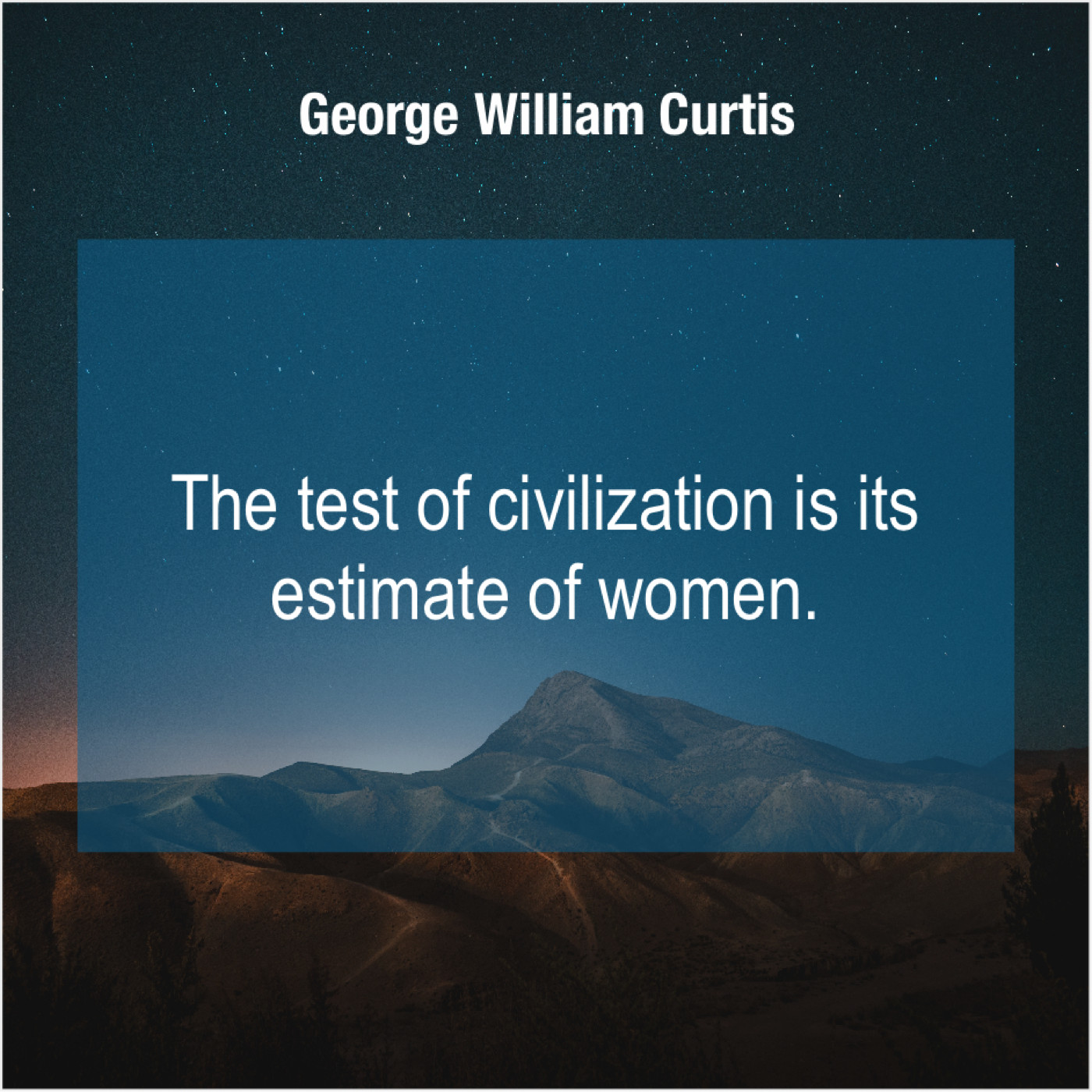 George William Curtis George William Curtis – The test of civilization is… July 27, 2019 admin “The test of civilization is its estimate of women.”-George William Curtis