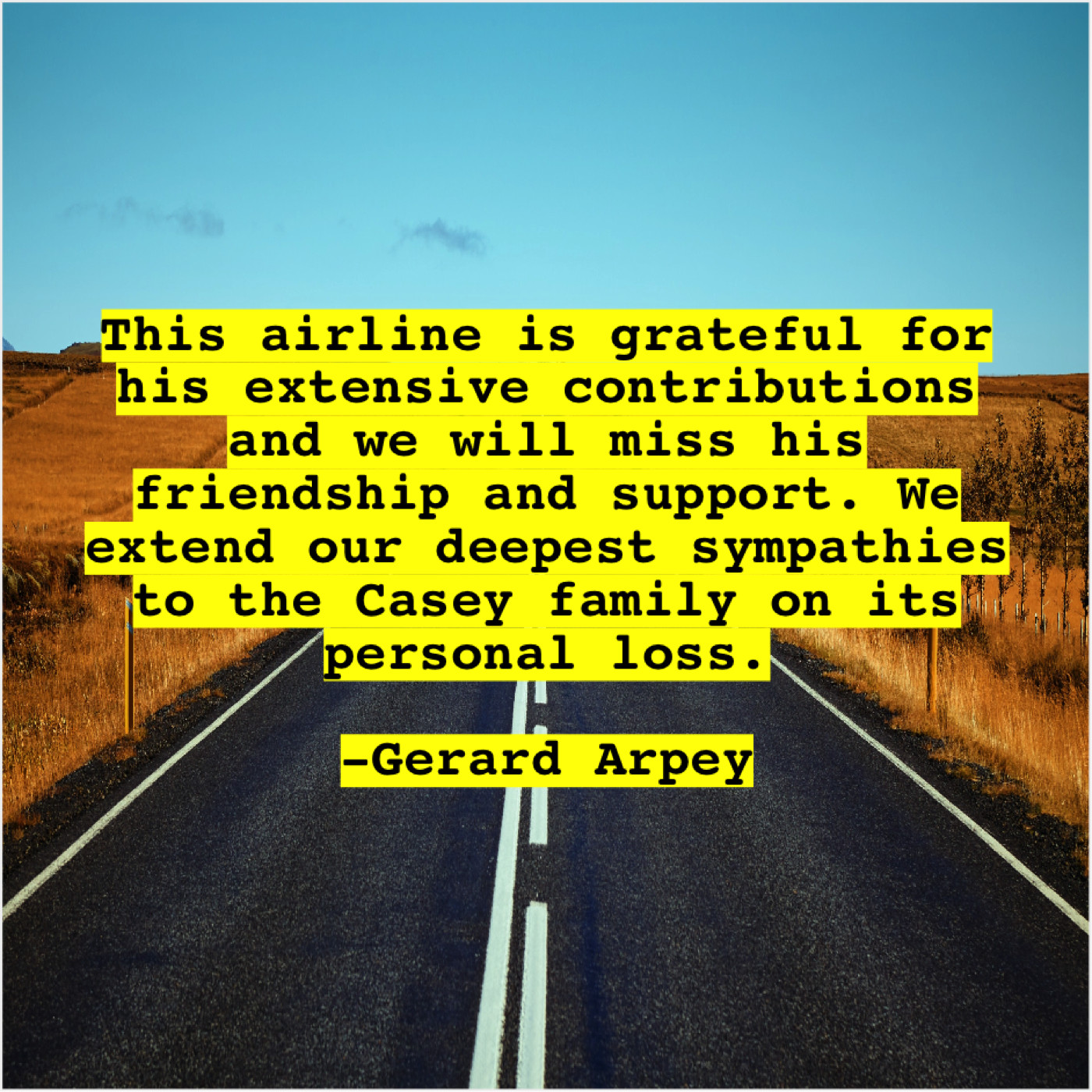Gerard Arpey Gerard Arpey – This airline is grateful for… May 10, 2019 admin “This airline is grateful for his extensive contributions and we will miss his friendship and support. We extend our deepest sympathies to the Casey family on its personal loss.”-Gerard Arpey