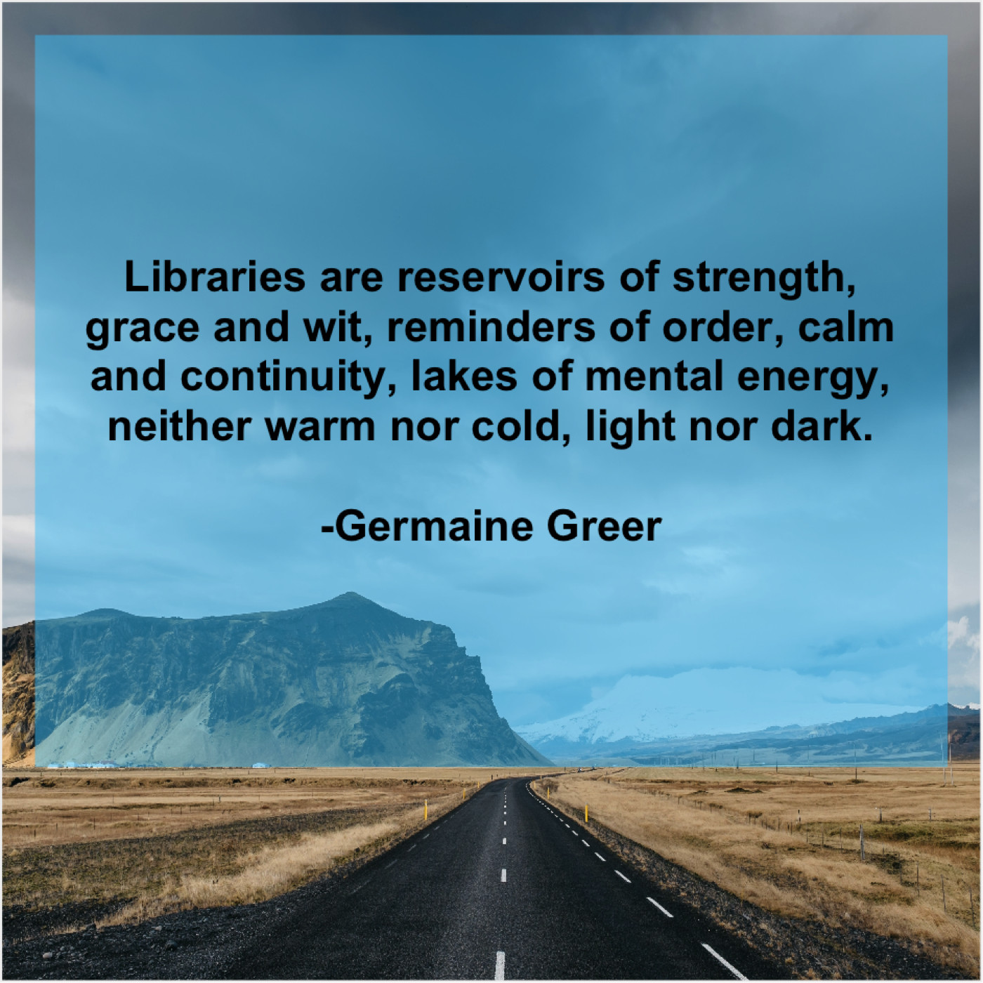 Germaine Greer Germaine Greer – Libraries are reservoirs of strength… February 5, 2019 admin “Libraries are reservoirs of strength, grace and wit, reminders of order, calm and continuity, lakes of mental energy, neither warm nor cold, light nor dark.”-Germaine Greer