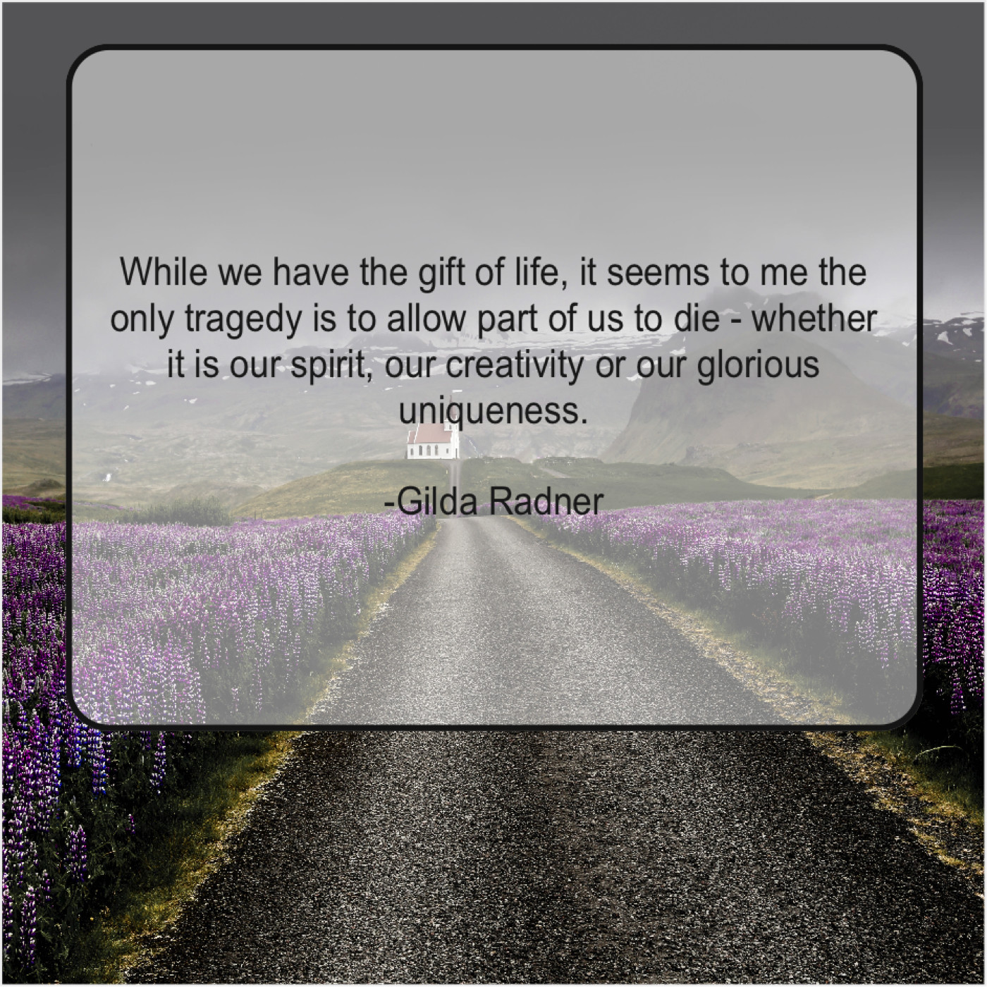 Gilda Radner Gilda Radner – While we have the gift… November 13, 2018 admin “While we have the gift of life, it seems to me the only tragedy is to allow part of us to die – whether it is our spirit, our creativity or our glorious uniqueness.”-Gilda Radner