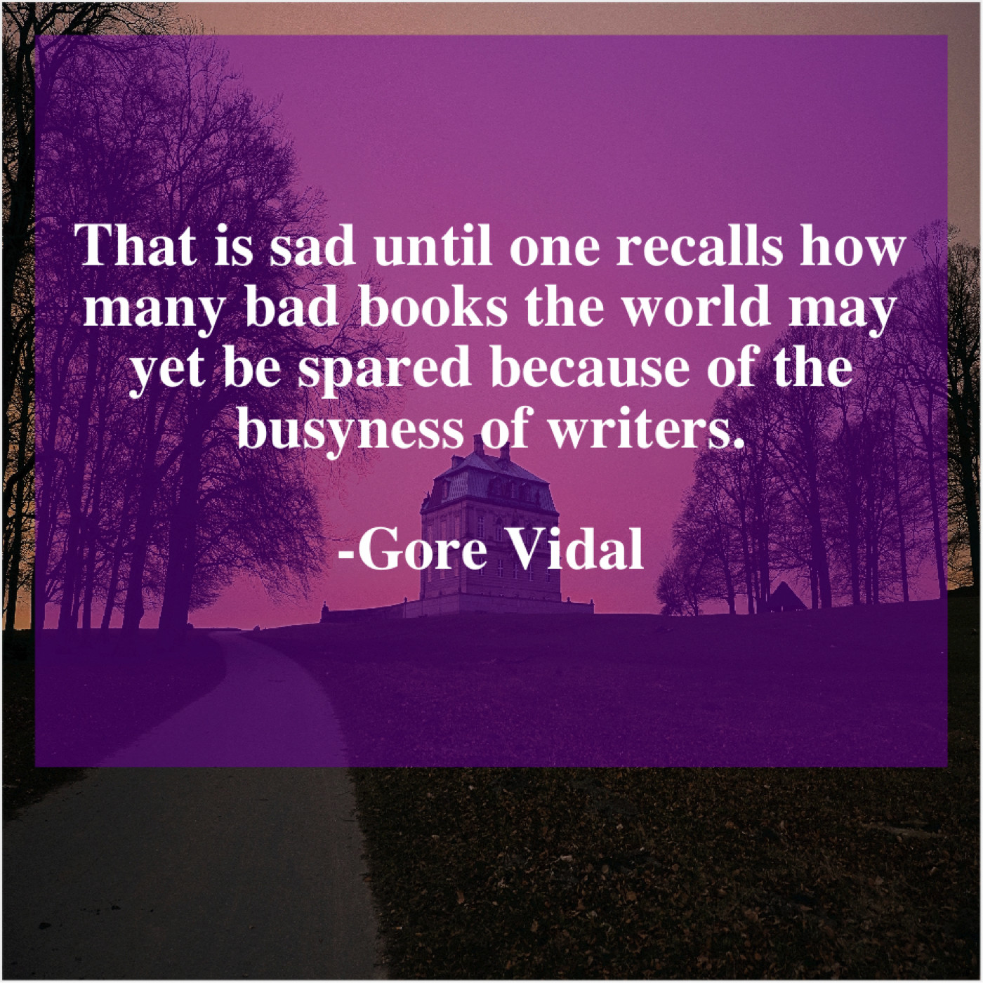 Gore Vidal Gore Vidal – That is sad until one… December 23, 2018 admin “That is sad until one recalls how many bad books the world may yet be spared because of the busyness of writers.”-Gore Vidal