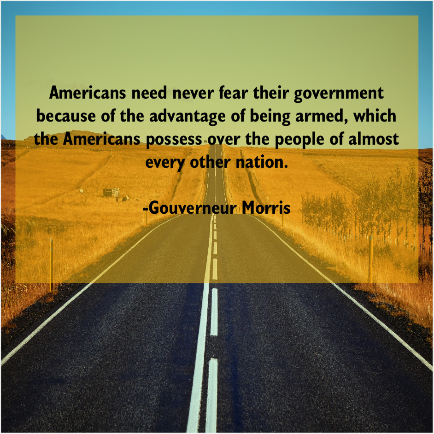 Gouverneur Morris Gouverneur Morris – Americans need never fear their… August 14, 2019 admin “Americans need never fear their government because of the advantage of being armed, which the Americans possess over the people of almost every other nation.”-Gouverneur Morris