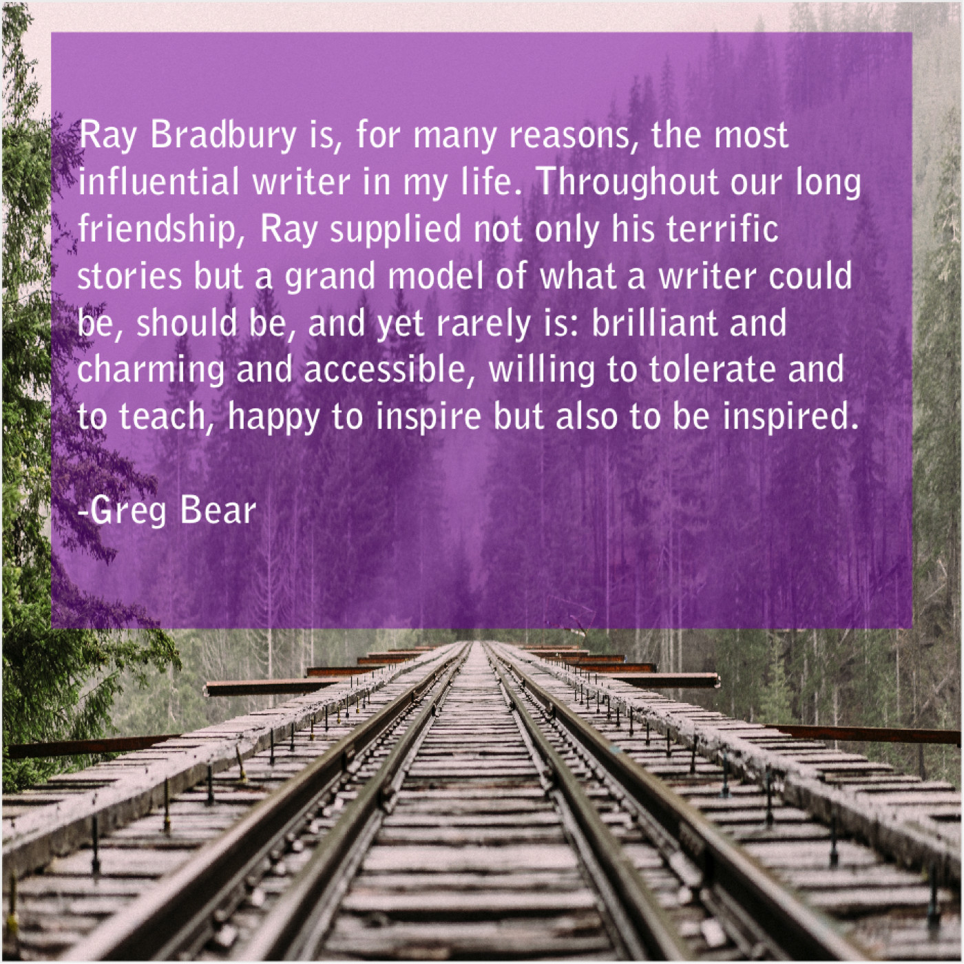 “Ray Bradbury is, for many reasons, the most influential writer in my life. Throughout our long friendship, Ray supplied not only his terrific stories but a grand model of what a writer could be, should be, and yet rarely is: brilliant and charming and accessible, willing to tolerate and to teach, happy to inspire but also to be inspired.”