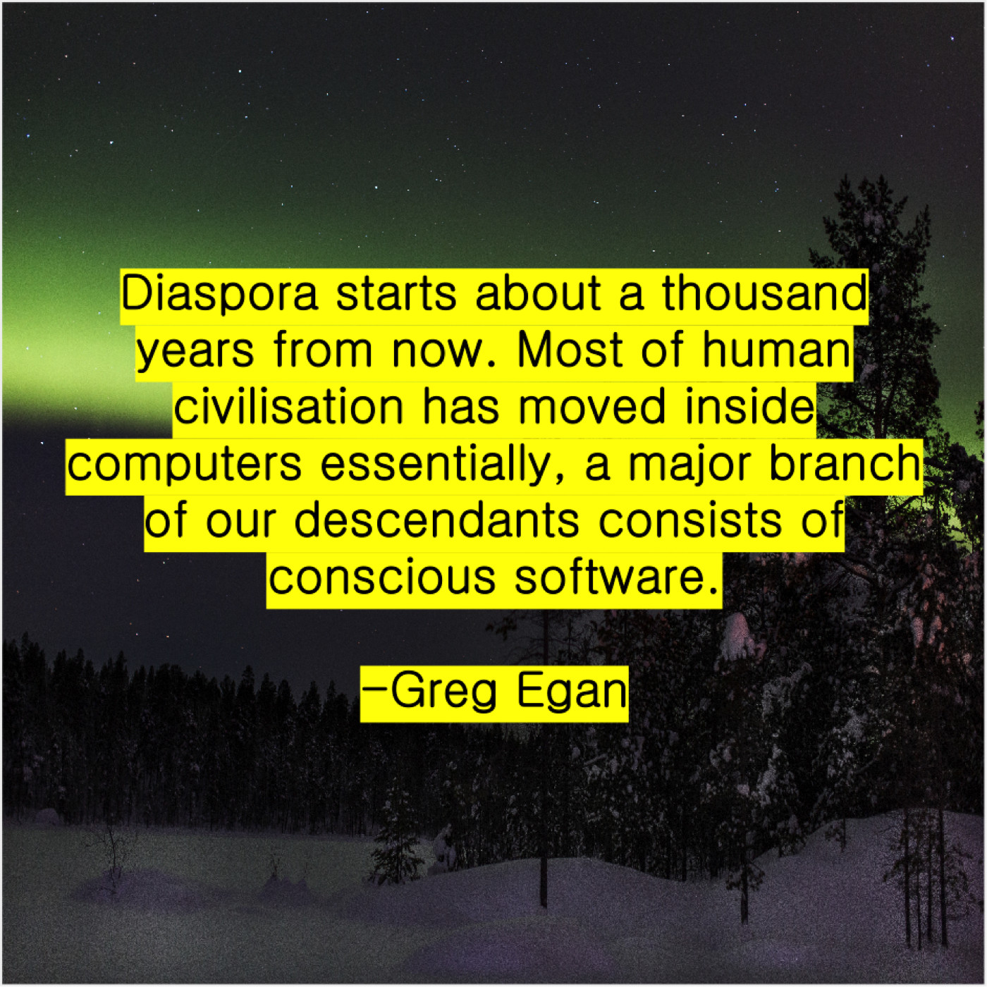 “Diaspora starts about a thousand years from now. Most of human civilisation has moved inside computers essentially, a major branch of our descendants consists of conscious software.”