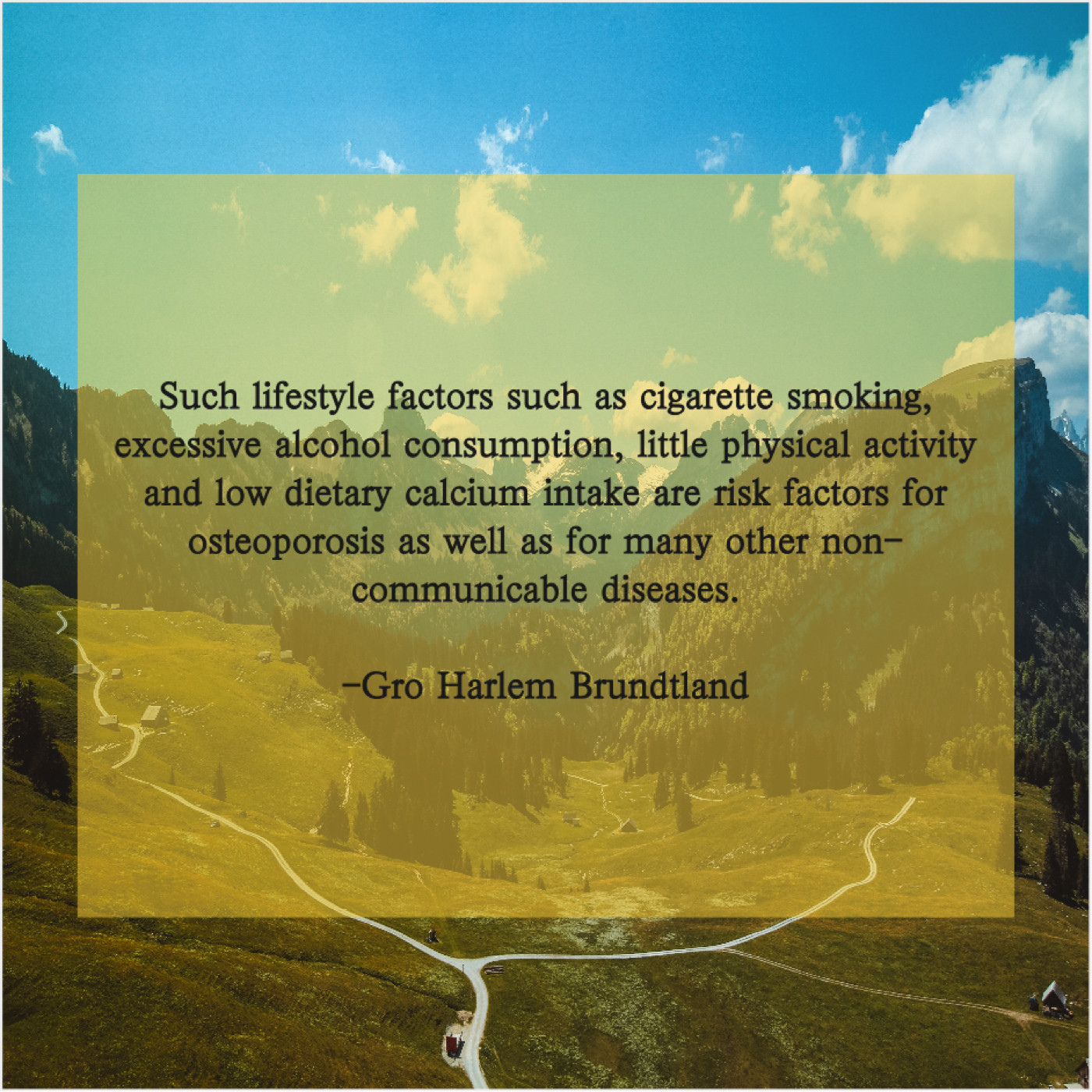 Gro Harlem Brundtland Gro Harlem Brundtland – Such lifestyle factors such as… March 25, 2019 admin “Such lifestyle factors such as cigarette smoking, excessive alcohol consumption, little physical activity and low dietary calcium intake are risk factors for osteoporosis as well as for many other non-communicable diseases.”-Gro Harlem Brundtland