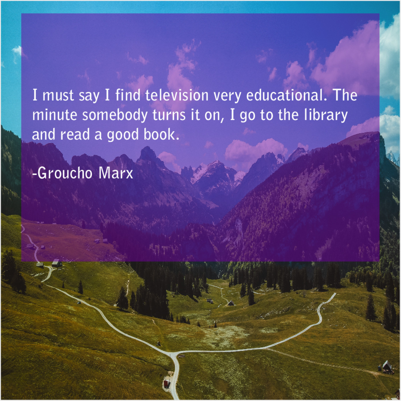 Groucho Marx Groucho Marx – I must say I find… January 11, 2019 admin “I must say I find television very educational. The minute somebody turns it on, I go to the library and read a good book.”-Groucho Marx