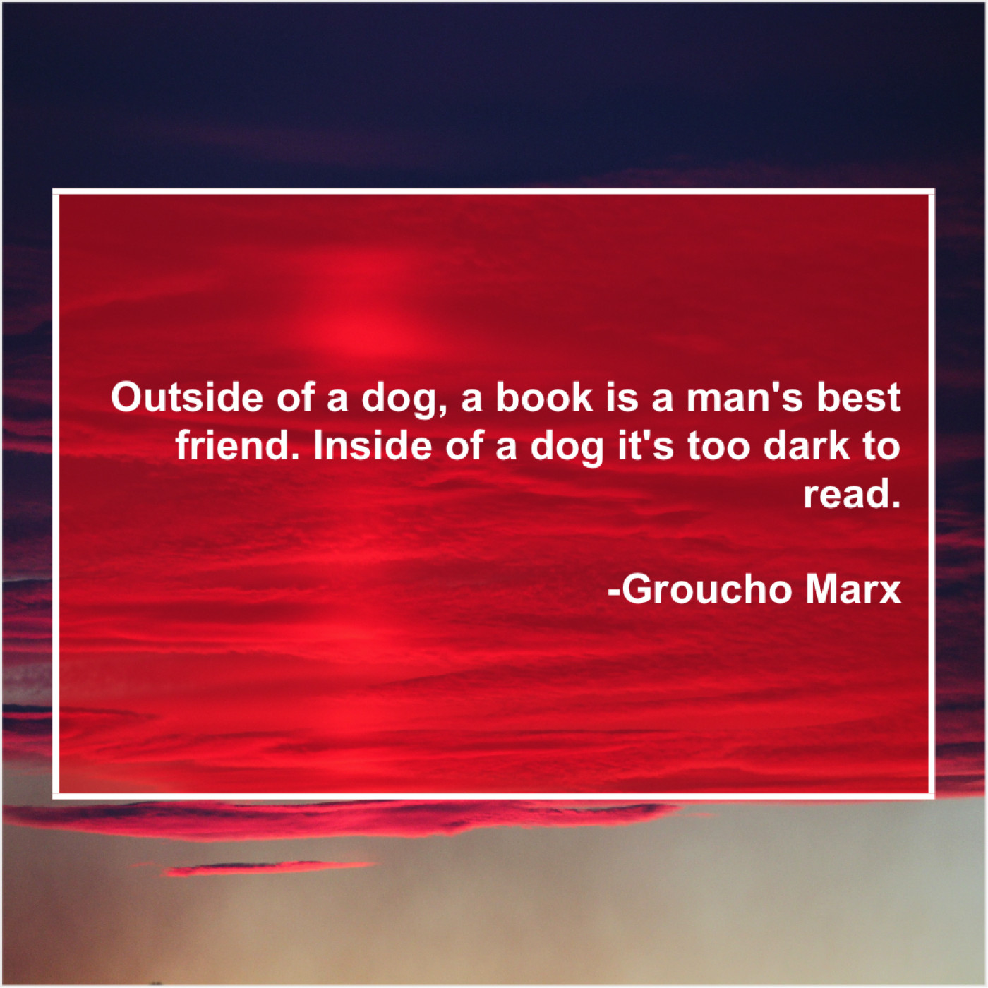 Groucho Marx Groucho Marx – Outside of a dog, a… September 28, 2019 admin “Outside of a dog, a book is a man’s best friend. Inside of a dog it’s too dark to read.”-Groucho Marx