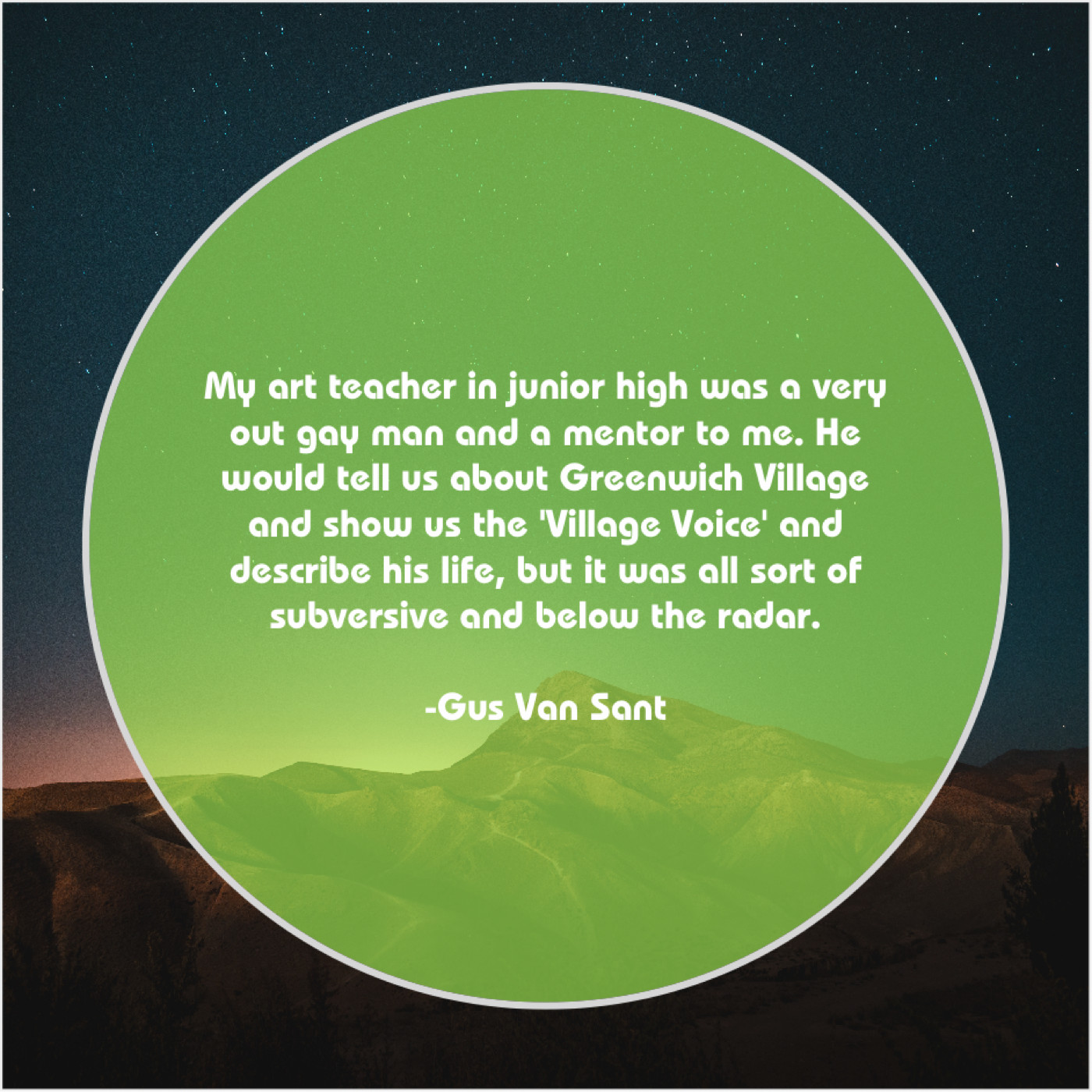 Gus Van Sant Gus Van Sant – My art teacher in junior… January 10, 2019 admin “My art teacher in junior high was a very out gay man and a mentor to me. He would tell us about Greenwich Village and show us the ‘Village Voice’ and describe his life, but it was all sort of subversive and below the radar.”-Gus Van Sant