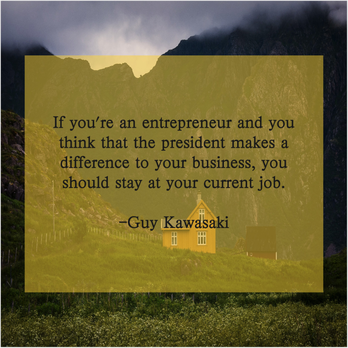 Guy Kawasaki Guy Kawasaki – If you’re an entrepreneur and… September 24, 2019 admin “If you’re an entrepreneur and you think that the president makes a difference to your business, you should stay at your current job.”-Guy Kawasaki