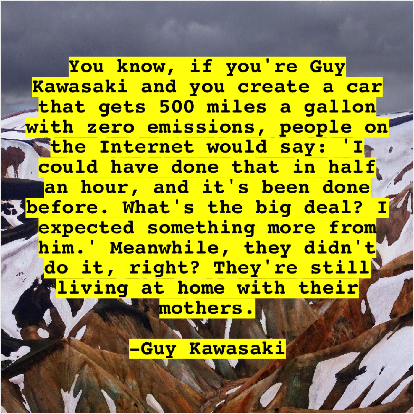 “You know, if you’re Guy Kawasaki and you create a car that gets 500 miles a gallon with zero emissions, people on the Internet would say: ‘I could have done that in half an hour, and it’s been done before. What’s the big deal? I expected something more from him.’ Meanwhile, they didn’t do it, right? They’re still living at home with their mothers.”