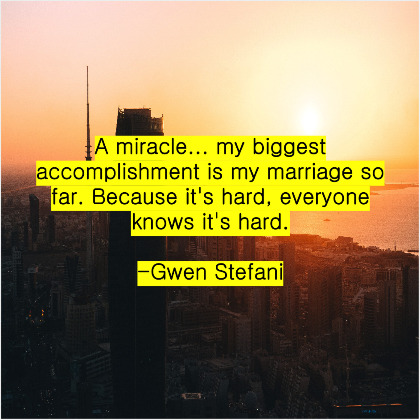 Gwen Stefani Gwen Stefani – A miracle… my biggest accomplishment… July 2, 2019 admin “A miracle… my biggest accomplishment is my marriage so far. Because it’s hard, everyone knows it’s hard.”-Gwen Stefani