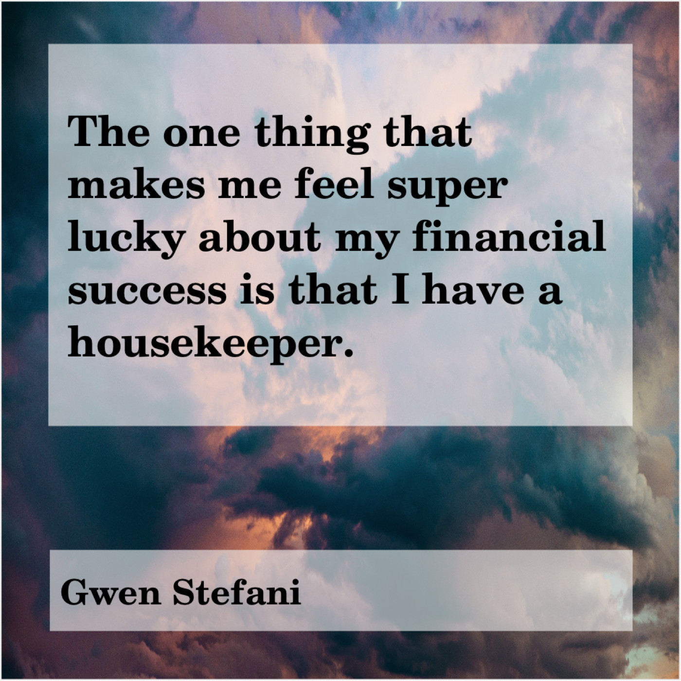 Gwen Stefani Gwen Stefani – The one thing that makes… November 10, 2018 admin “The one thing that makes me feel super lucky about my financial success is that I have a housekeeper.”-Gwen Stefani