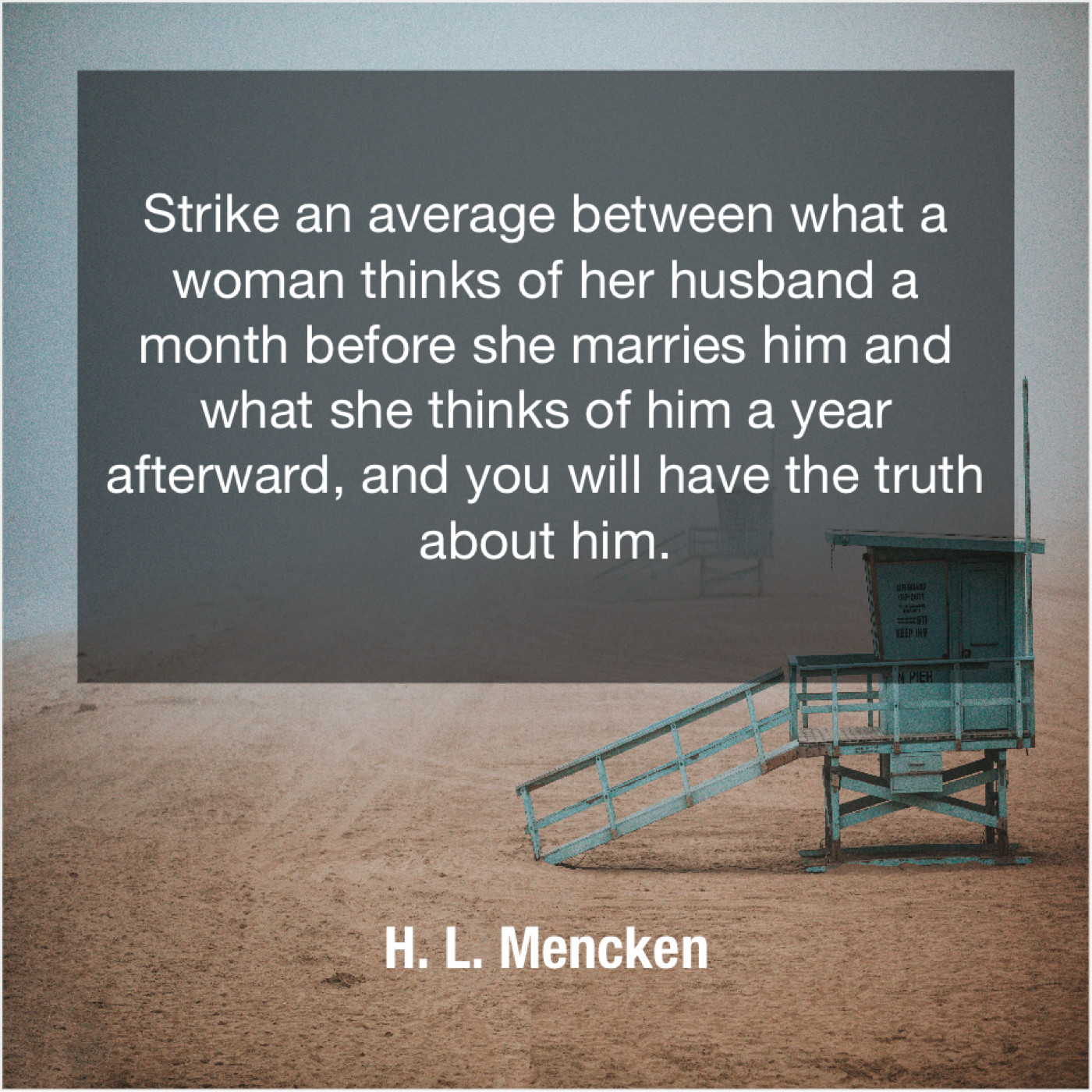 H. L. Mencken H. L. Mencken – Strike an average between what… March 9, 2019 admin “Strike an average between what a woman thinks of her husband a month before she marries him and what she thinks of him a year afterward, and you will have the truth about him.”-H. L. Mencken