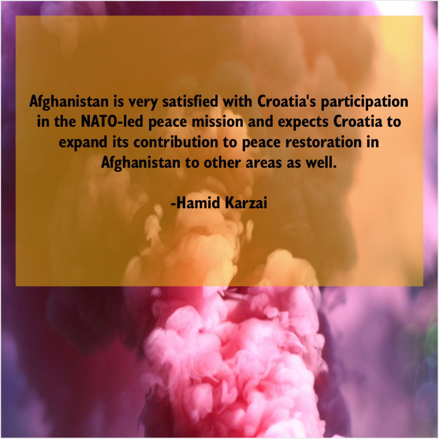 Hamid Karzai Hamid Karzai – Afghanistan is very satisfied with… June 5, 2019 admin “Afghanistan is very satisfied with Croatia’s participation in the NATO-led peace mission and expects Croatia to expand its contribution to peace restoration in Afghanistan to other areas as well.”-Hamid Karzai
