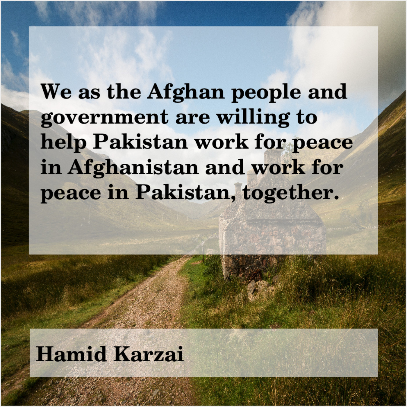 Hamid Karzai Hamid Karzai – We as the Afghan people… July 17, 2019 admin “We as the Afghan people and government are willing to help Pakistan work for peace in Afghanistan and work for peace in Pakistan, together.”-Hamid Karzai